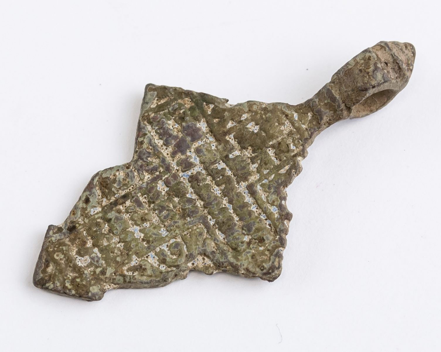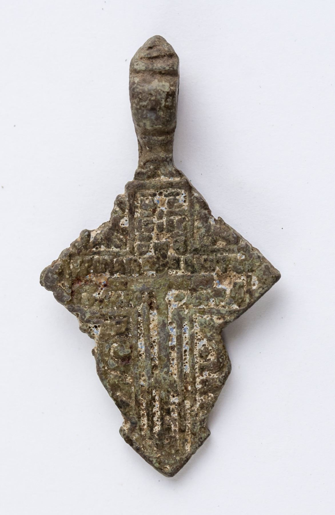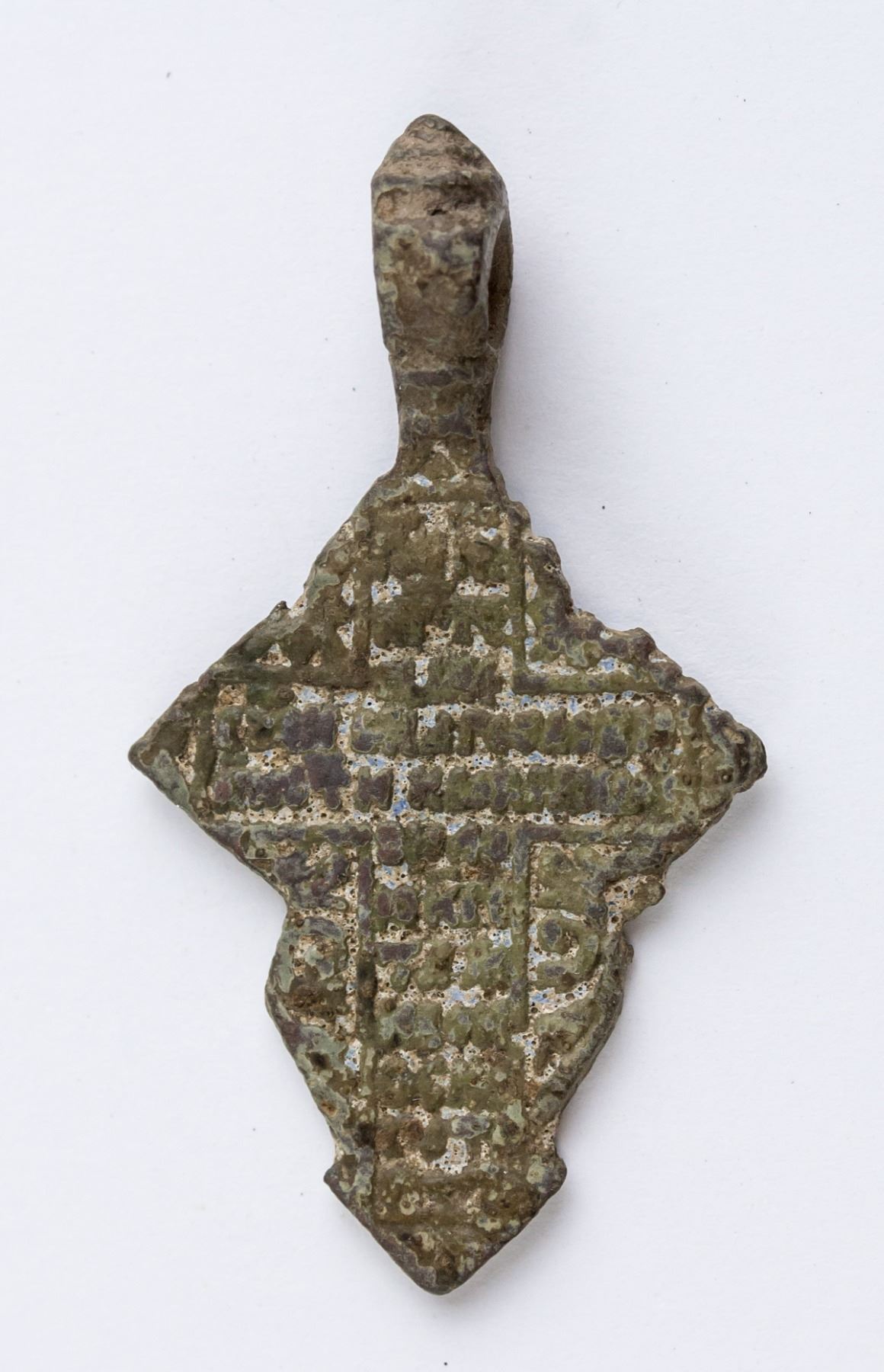 17-18th century Russian Orthodox bronze pendant. Featuring cross form with bail ring. 40 x 20 mm, 4.5 grams. PROVENANCE: Private collection (Virginia, United States)