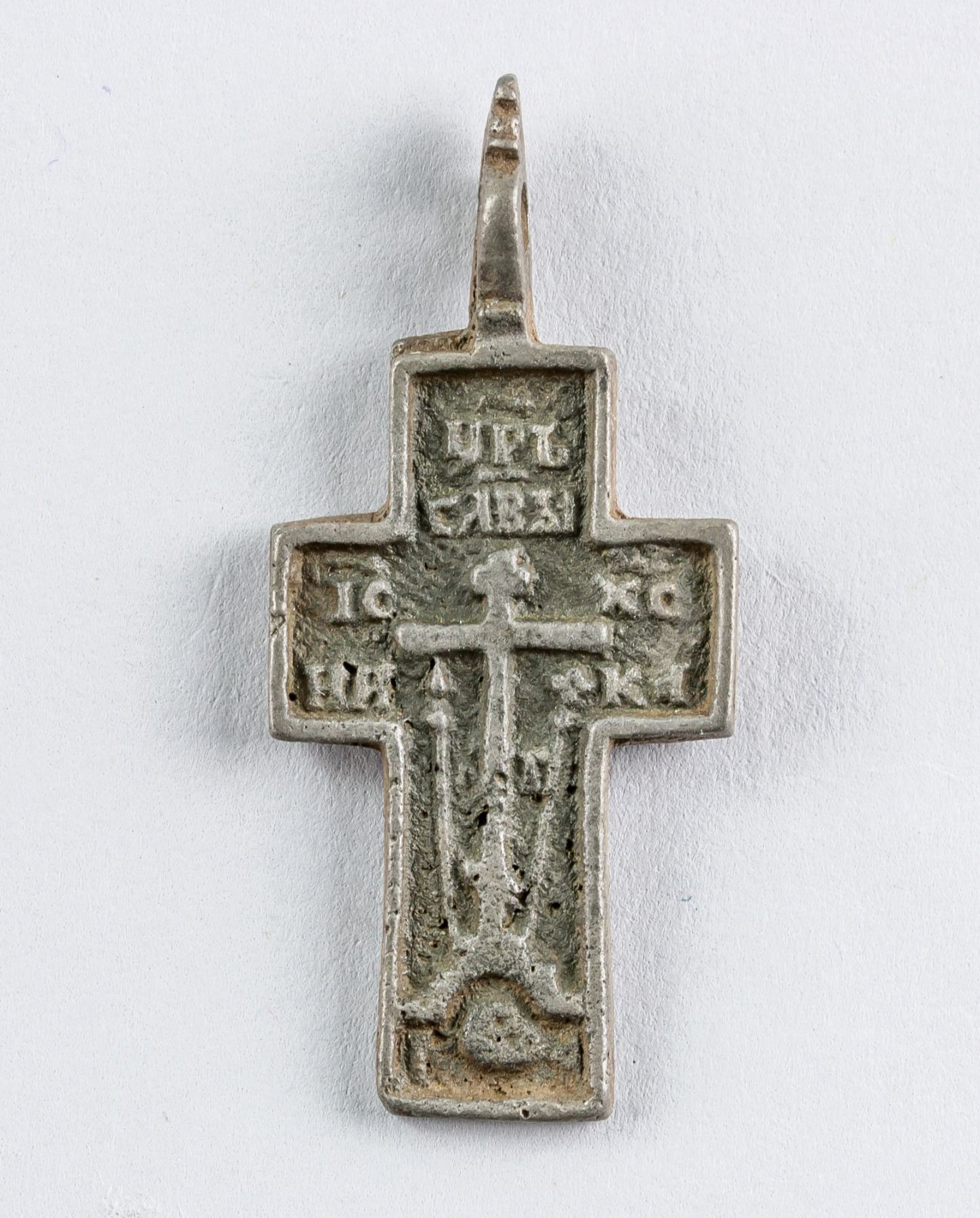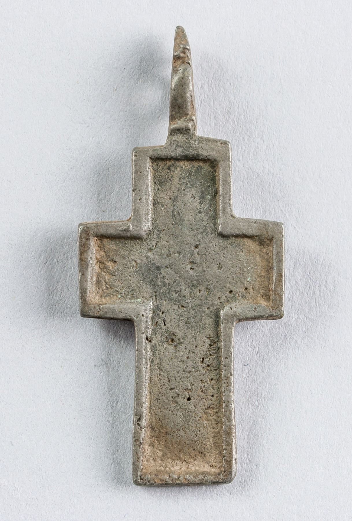 17-18th Century Russian Orthodox bronze cross pendant, 47 x 21 mm, 6.330 grams. PROVENANCE: Private collection (Virginia, United States)