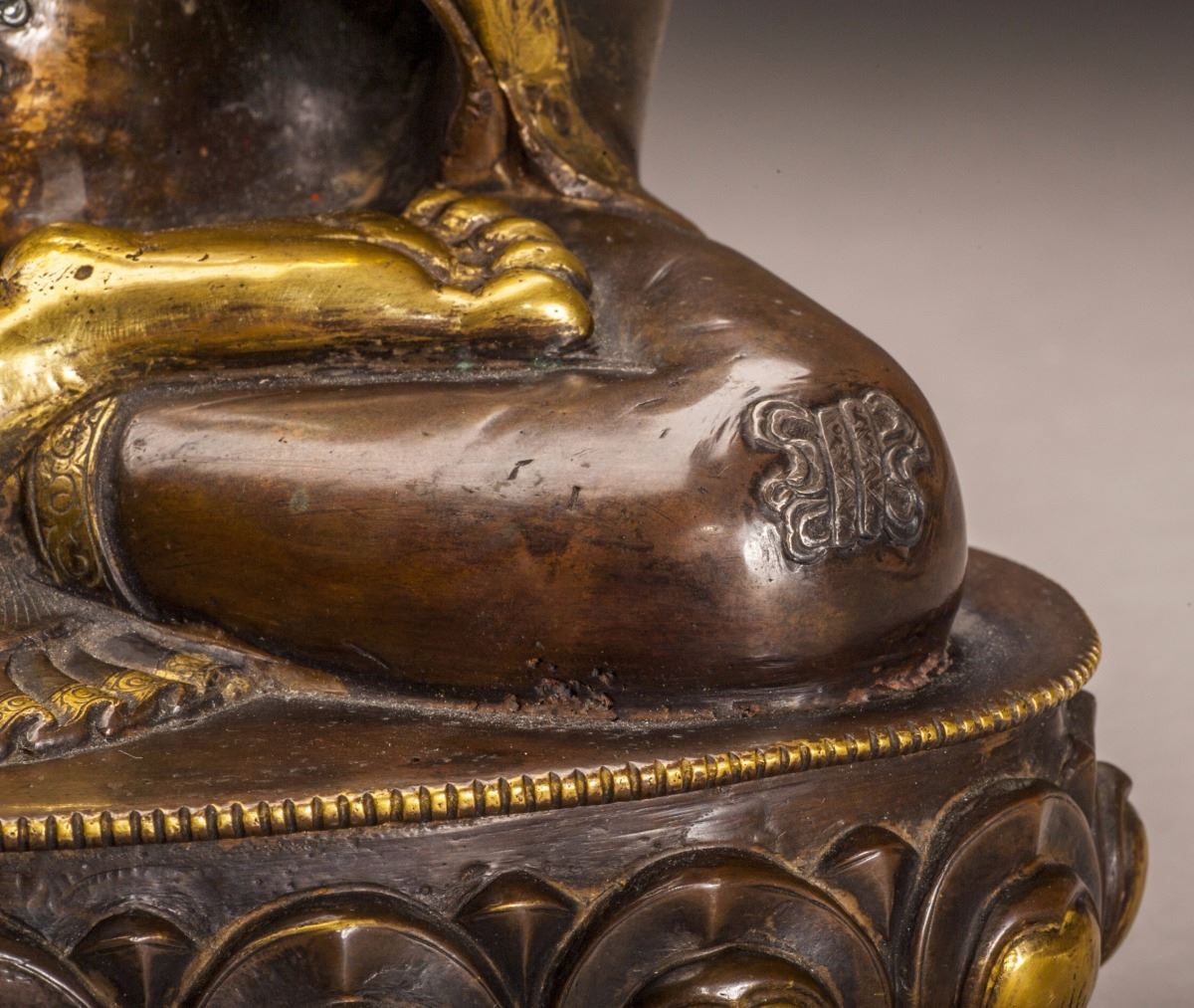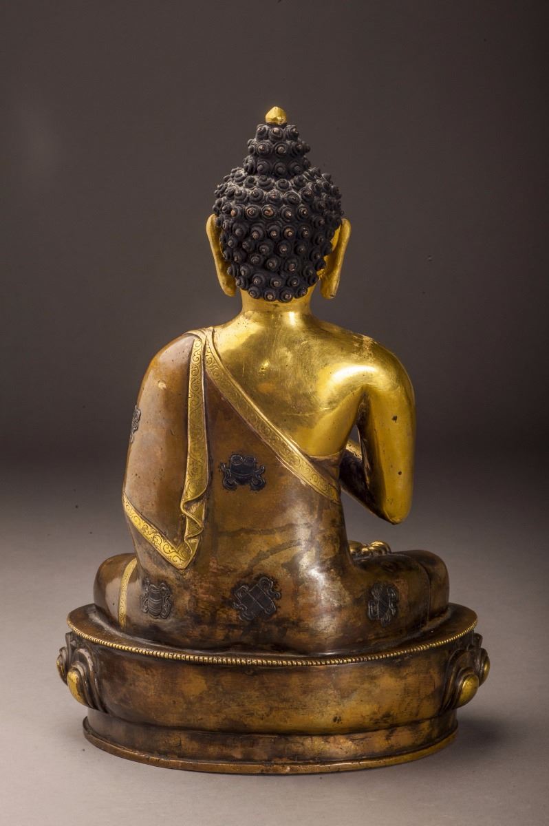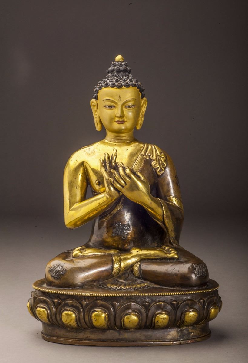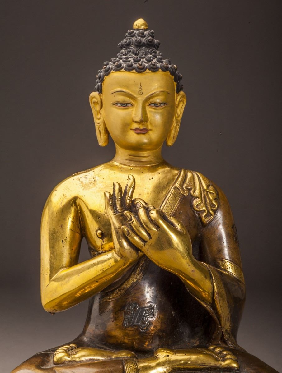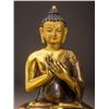 A Fine And Rare Gilt Buddha Statue In Good Condition, Designed In Extremely Detailed And With The Face Vividly Expressed. The Buddha Siting On The Lotus Stand, With Both Legs Folded, Half Bare Shoulder, Fine Headwear.