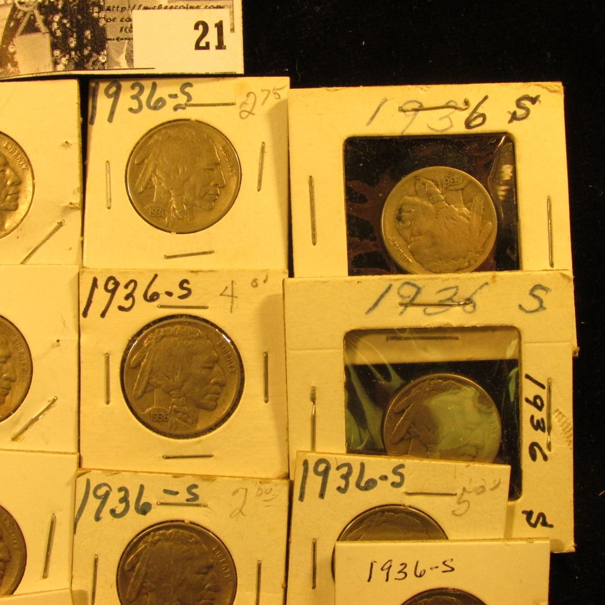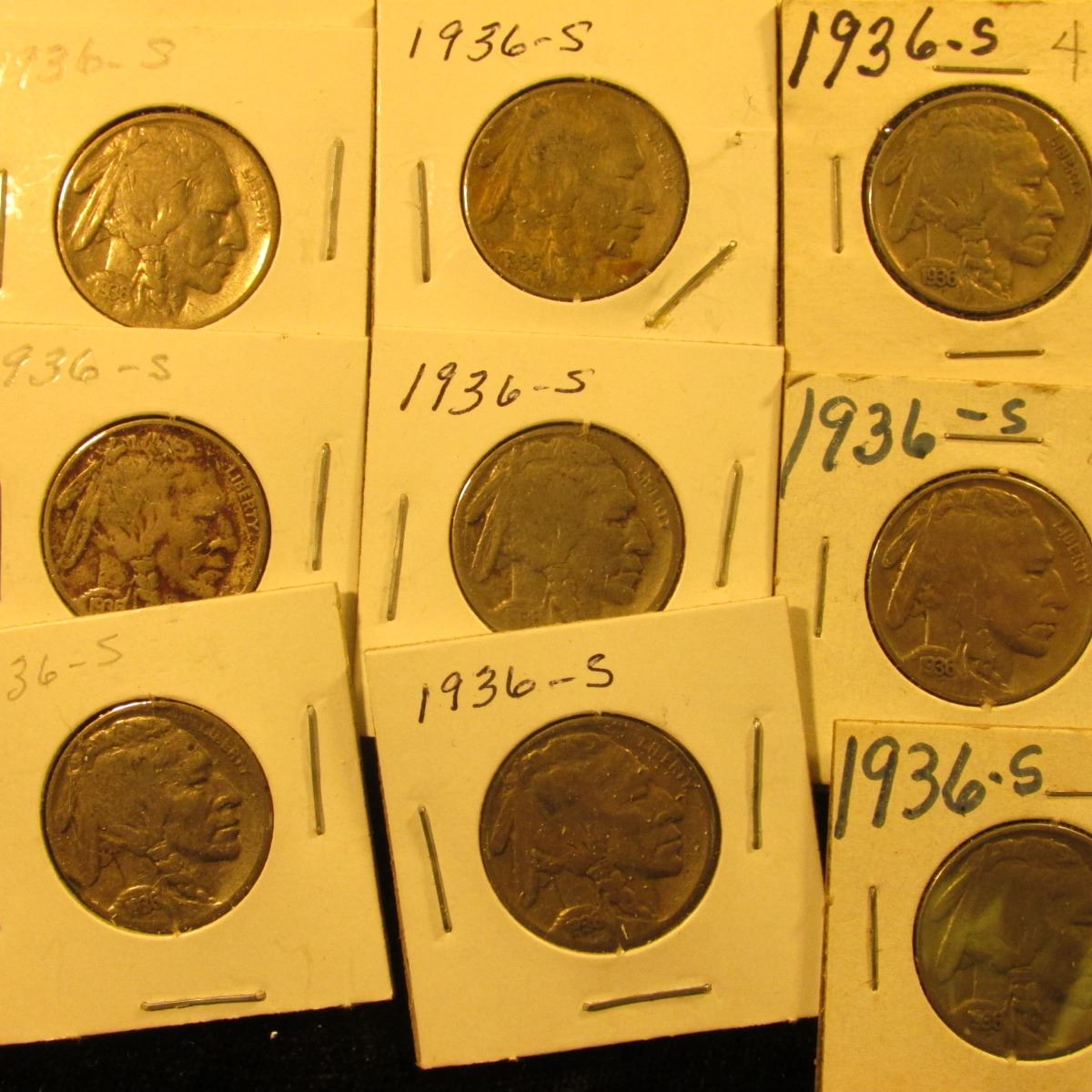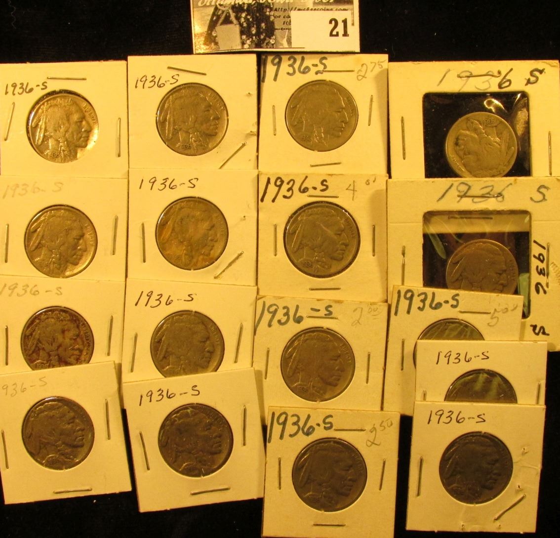 (17) 1936 S Buffalo Nickels all carded in 1 1/2" & 2" holders. Some slightly better grades.