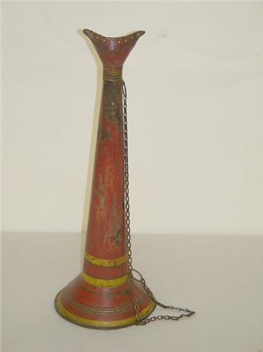 17" 19TH CENT. PAINTED TIN (TOLE) TRUMPET W/ CHAIN- RED W/ YELLOW & GREEN STIPES - PAINT WEAR & LOSSES, MINOR DENTS;