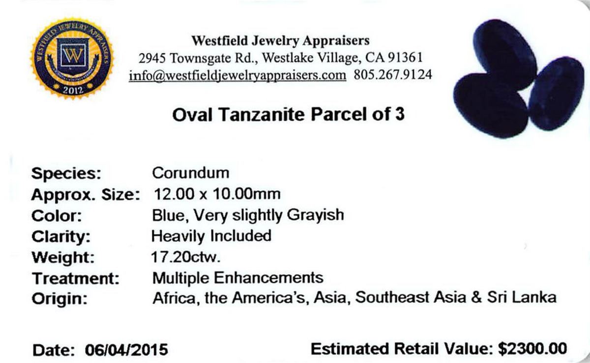 Three oval mixed cut natural blue sapphires, measuring 12.00 x 10.00 x 6.00mm, exact total weight 17.20ct., clarity is heavily included, type II, very dark, very slightly grayish, blue color, (GIA B 8/3), cut is good. Measurements are an average for the group. Transmitting light very diffusely, opaque. Naturally occurring internal & external characteristics are present. Indications of multiple laboratory enhancements, including high temperature heat treatment. Westfield Appraised at $2,300.00.