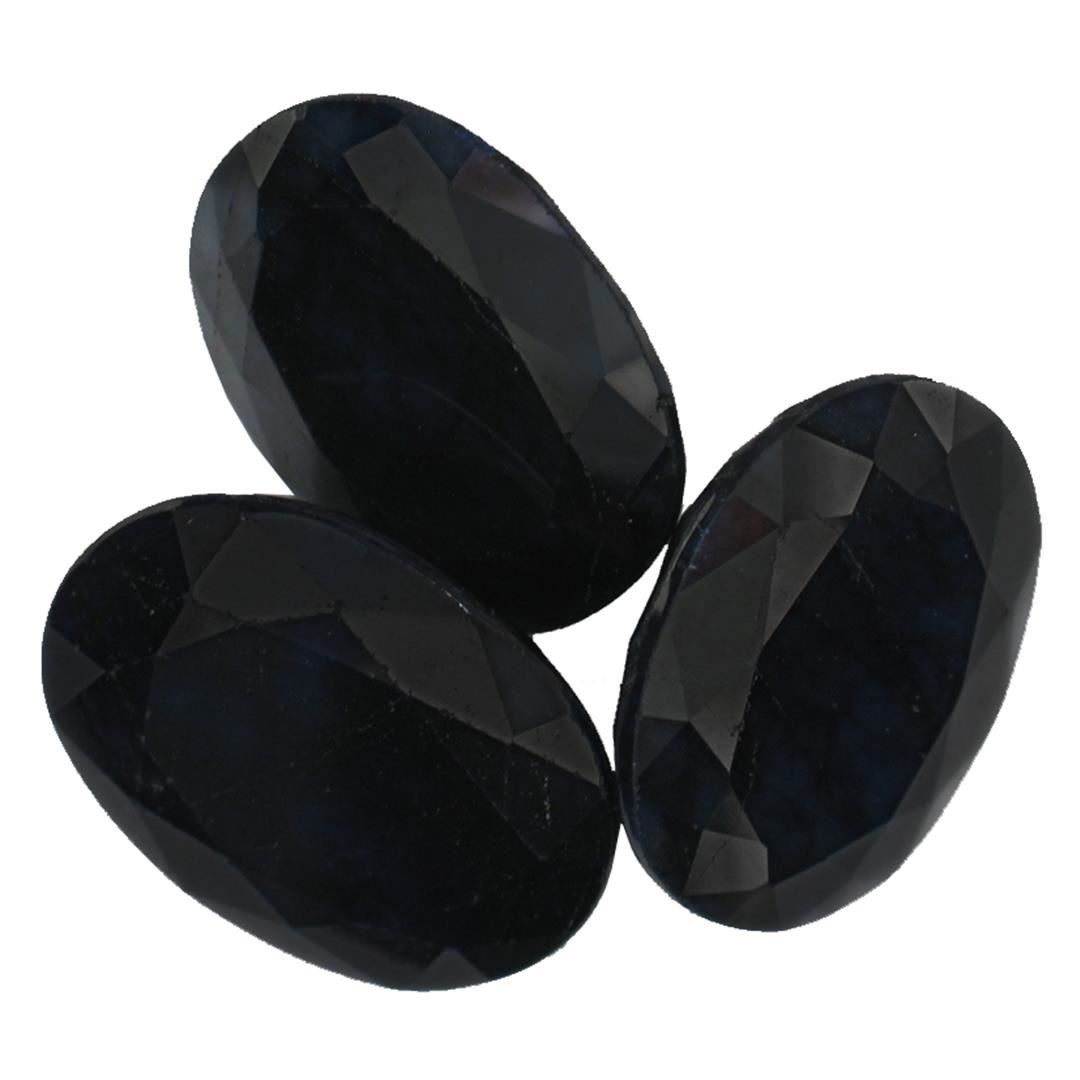 Three oval mixed cut natural blue sapphires, measuring 12.00 x 10.00 x 6.00mm, exact total weight 17.20ct., clarity is heavily included, type II, very dark, very slightly grayish, blue color, (GIA B 8/3), cut is good. Measurements are an average for the group. Transmitting light very diffusely, opaque. Naturally occurring internal & external characteristics are present. Indications of multiple laboratory enhancements, including high temperature heat treatment. Westfield Appraised at $2,300.00.