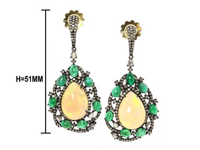Opal, Emerald AND DIAMOND EARRING/Diamond Count 1:/Diamond 1 TCW:2.34/Diamond Color & Clarity:J-L/I1-I2/Diamond Count 2:/Diamond 2 TCW:/Diamond Count 3:/Diamond 3 TCW:/Diamond Color & Clarity:/Gemstone Count 1: 2/Gemstone 1 TCW:14.88/Gemstone Type:Opal/Gemstone Count 2: 14/Gemstone 2 TCW:/Gemstone Type:Emerald/Gemstone Count 3: /Gemstone 3 TCW:/Gemstone Type:/Metal 1:18k GoldYellow Gold/Gram Weight:1.46over0.925 SilverSterling Silver /Weight/gram:8.42/Gross Weight:14.44/Item-Size (HxW mm):51xW