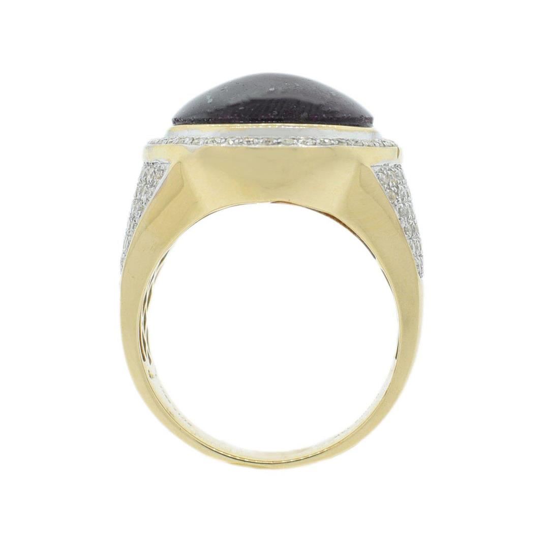 One electronically tested 14KT yellow gold cast star ruby and diamond ring. Condition is new, good workmanship. The featured star ruby is set within a diamond bezel supported by tapering diamond set shoulders, completed by a four and one-half millimeter w