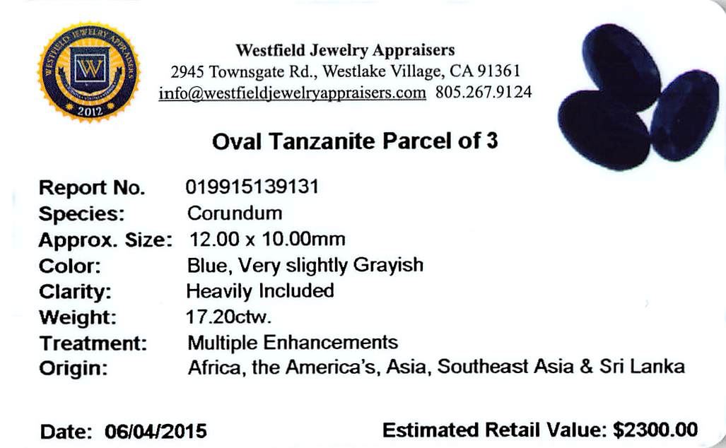Three oval mixed cut natural blue sapphires, measuring 12.00 x 10.00 x 6.00mm, exact total weight 17.20ct., clarity is heavily included, type II, very dark, very slightly grayish, blue color, (GIA B 8/3), cut is good. Measurements are an average for the group. Transmitting light very diffusely, opaque. Naturally occurring internal & external characteristics are present. Indications of multiple laboratory enhancements, including high temperature heat treatment. Westfield Appraised at $2,300.00.