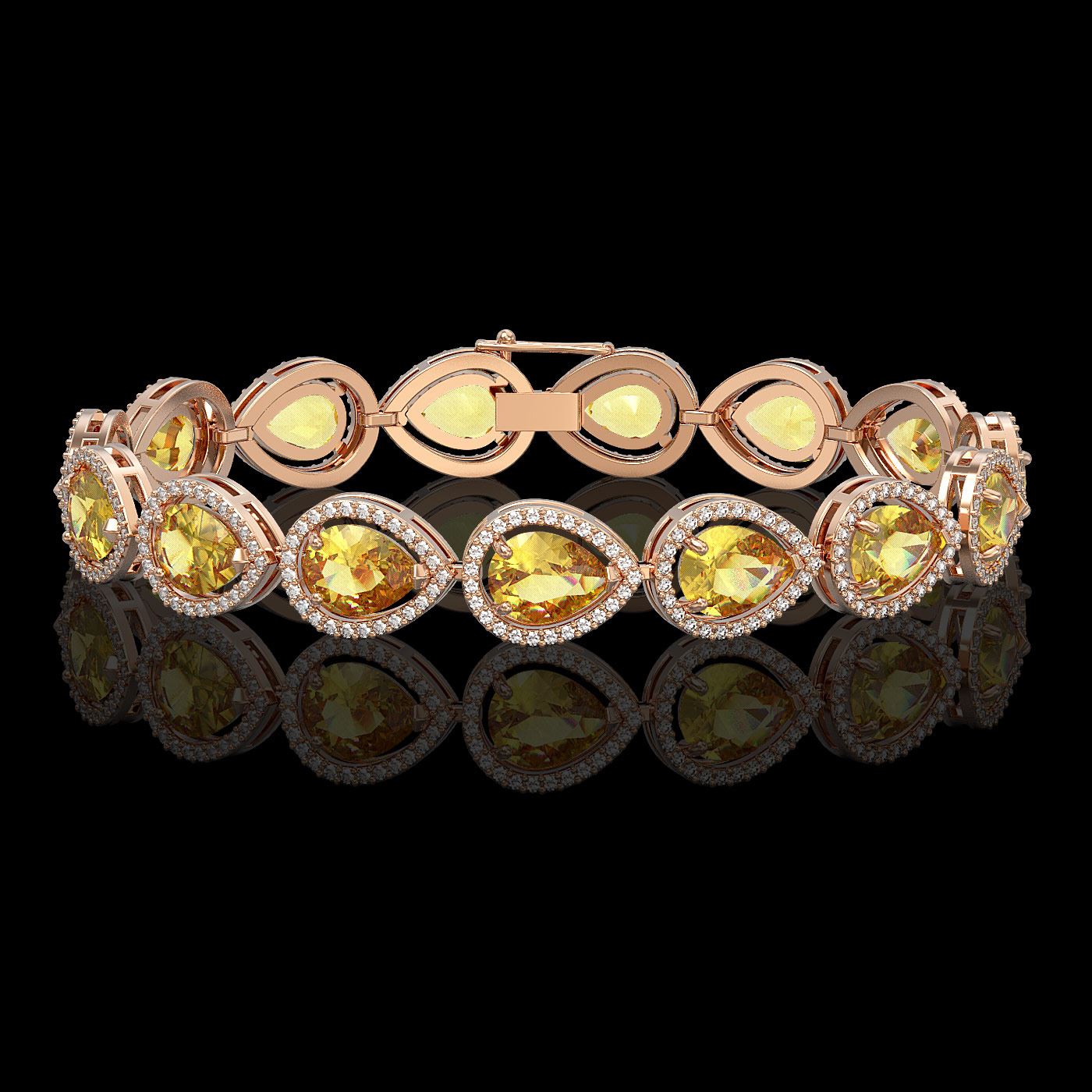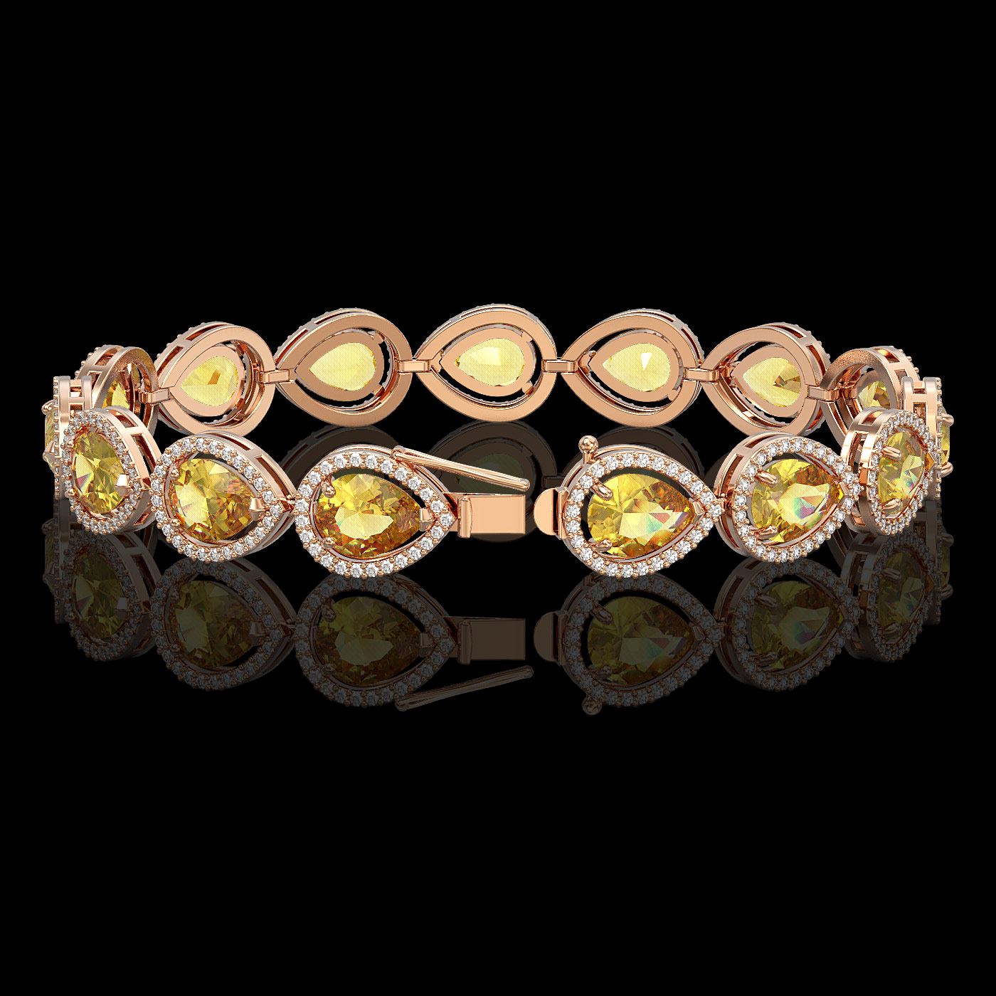 REF-282K9W -41277 ---- 17.3 CTW Fancy Citrine & Diamond Halo Bracelet 10K Rose Gold ---- Luxury Designer Brand Bracelet Appraised at $15,550 Certificate Number US41277 10k Rose gold, Bracelet Size is 7 Inches, Bracelet measuring approx. 10 mm x 7 Inches, weighing in total approx. 14.5 grams. Made in the USA and is stamped 10k, Main stone 14.25 carat total weight containing 15 pieces of Intense Translucent Yellow color with AAA quality Pear shape cut Citrine , Stone #2 3.05 carat total weight containing 375 pieces of G-H color with VS/SI quality Round shape cut Diamond