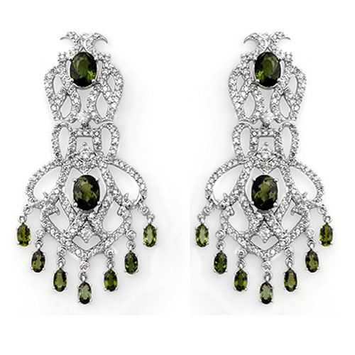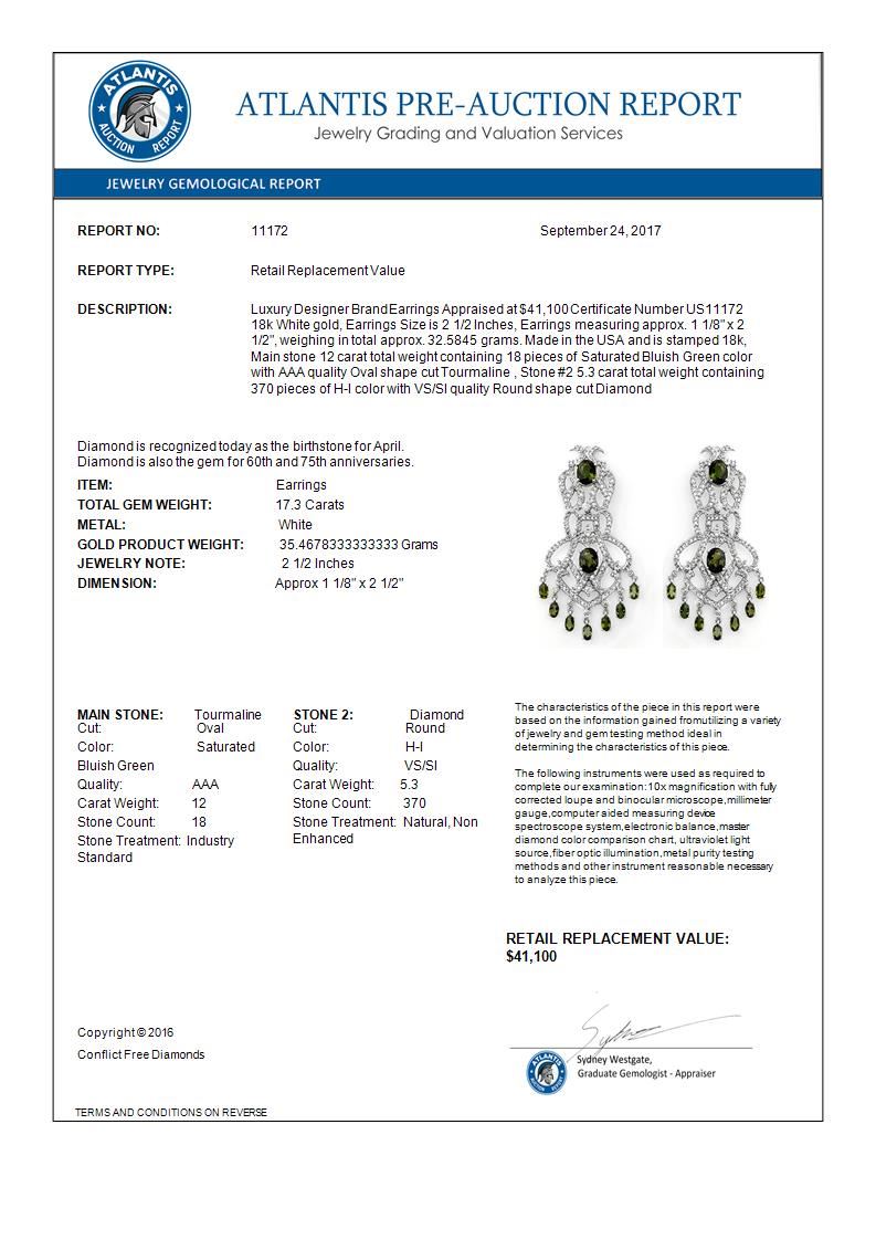 11172 - REF-533M8F ---- 17.30 CTW Green Tourmaline & Diamond Earrings 18K White Gold ---- Luxury Designer Brand Earrings Appraised at $41,100 Certificate Number US11172 18k White gold, Earrings Size is 2 1/2 Inches, Earrings measuring approx. 1 1/8" x 2 1/2", weighing in total approx. 32.5845 grams. Made in the USA and is stamped 18k, Main stone 12 carat total weight containing 18 pieces of Saturated Bluish Green color with AAA quality Oval shape cut Tourmaline , Stone #2 5.3 carat total weight containing 370 pieces of H-I color with VS/SI quality Round shape cut Diamond