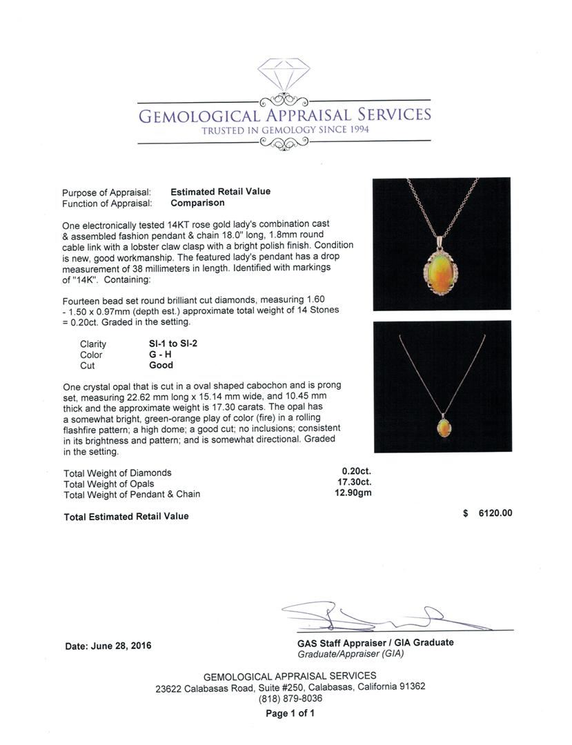 One electronically tested 14KT rose gold lady's combination cast & assembled fashion pendant & chain 18.0" long, 1.8mm round cable link with a lobster claw clasp with a bright polish finish. The featured lady's pendant has a drop measurement of 38 millimeters in length. Identified with markings of "14K". Condition is new, good workmanship. Containing: Fourteen bead set round brilliant cut diamonds, measuring 1.60 - 1.50 x 0.97mm (depth est.) approximate total weight of 14 Stones = 0.20ct. Graded in the setting. Clarity: SI-1 to SI-2. Color: G - Good One crystal opal that is cut in a oval shaped cabochon and is prong set, measuring 22.62 mm long x 15.14 mm wide, and 10.45 mm thick and the approximate weight is 17.30 carats. The opal has a somewhat bright, green-orange play of color (fire) in a rolling flashfire pattern; a high dome; a good cut; no inclusions; consistent in its brightness and pattern; and is somewhat directional. Graded in the setting. Total Weight of Diamonds 0.20ct. Total Weight of Opals 17.30ct. Total Weight of Pendant & Chain 12.90gm. GAS Appraised at $6,120.00.