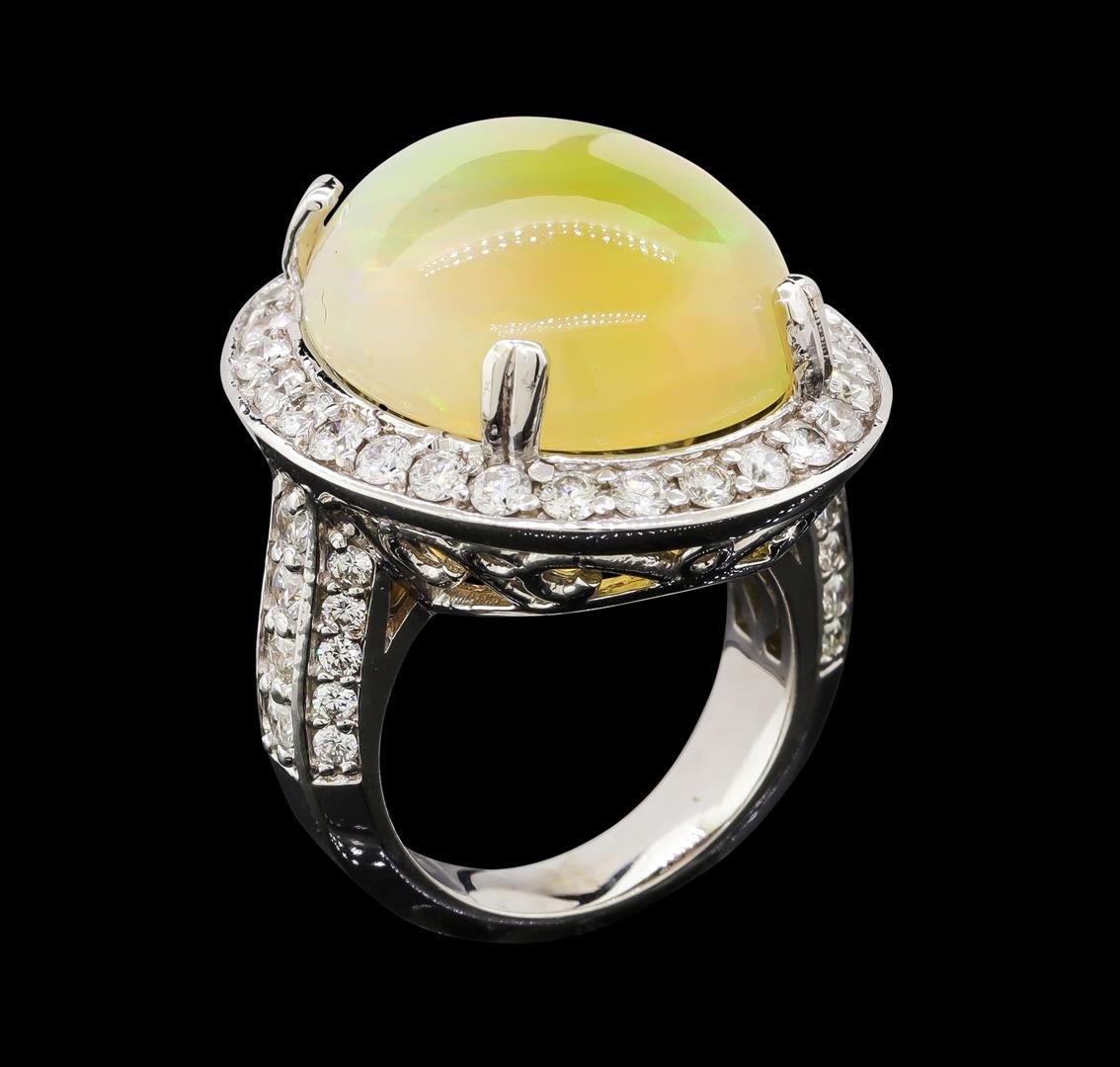 One electronically tested 14KT white gold lady's cast fashion ring with a basket halo with a bright polish finish. The featured lady's ring has a three-sided, diamond set beveled shank measuring 4.35 millimeters. Identified with markings of '14K'. Condition is new, good workmanship. Containing: One crystal opal that is cut in a oval shaped cabochon and is prong set, measuring 21.05 mm long x 17.20 mm wide, and 9.24 mm thick and the approximate weight is 17.30 carats. The opal has a somewhat bright, orange-green play of color (fire) in a rolling flashfire pattern; a medium dome; a good cut; slightly included; distracting variation in base in its brightness and pattern; and is very directional. Graded in the setting. Thirty-Six prong set round brilliant cut diamonds, measuring 2.30 - 2.20 x 1.35mm (depth est.) approximate total weight of 36 Stones = 1.50ct. Graded in the setting. Clarity SI-1 to I-1. Color: H - I Cut Good Twenty prong set round brilliant cut diamonds, measuring 1.80 - 1.70 x 1.05mm (depth est.) approximate total weight of 20 Stones = 0.38ct. Graded in the setting. Clarity SI-1 to SI-2. Color: H - I Cut Good. Total Weight of Diamonds 1.88ct.. Total Weight of Opals 17.30ct.. Total Weight of Ring 18.10gm. GAS Appraised at $10,460.00.