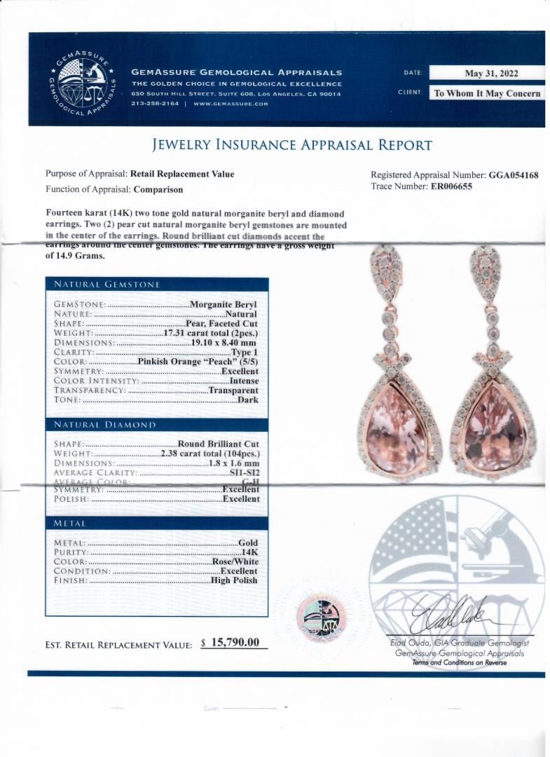 Fourteen karat (14K) two tone gold natural morganite beryl and diamond earrings. Two (2) pear cut natural morganite beryl gemstones are mounted in the center of the earrings. Round brilliant cut diamonds accent the earrings around the center gemstones. The earrings have a gross weight of 14.9 Grams. #NATURAL GEMSTONE# GEMSTONE: Morganite Beryl NATURE: Natural SHAPE: Pear, Faceted Cut WEIGHT: 1.31 carat total (2pcs.) DIMENSIONS: 19.10 x 8.40mm CLARITY: Type 1 COLOR: Pinkish Orange "Peach" (5/5) SYMMETRY: Excellent COLOR INTENSITY: Intense TRANSPARENCY: Transparent TONE: Dark #NATURAL DIAMOND# SHAPE: Round Brilliant Cut WEIGHT: 2.38 carat total (104pcs.) DIMENSIONS: 1.8 x 1.6mm AVERAGE CLARITY: SI1-SI2 AVERAGE COLOR: G-H SYMMETRY: Excellent POLISH: Excellent #METAL# METAL: Gold PURITY: 14K COLOR: Rose/White CONDITION: Excellent FINISH: High Polish