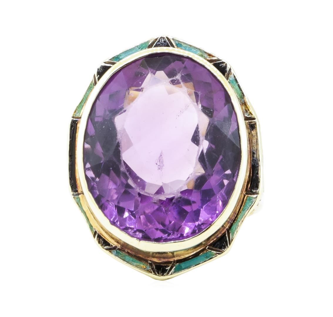 One ring featuring: 14KT yellow gold weighing 12.6 grams containing one amethyst weighing 17.32ct and black and green enamel.