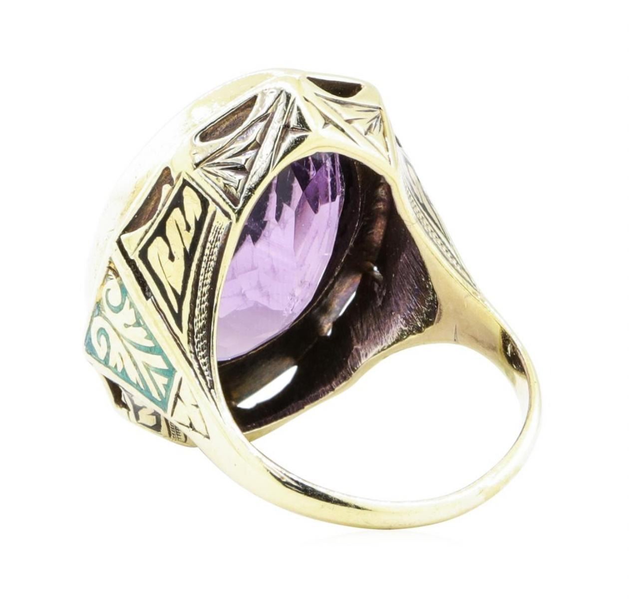One ring featuring: 14KT yellow gold weighing 12.6 grams containing one amethyst weighing 17.32ct and black and green enamel.