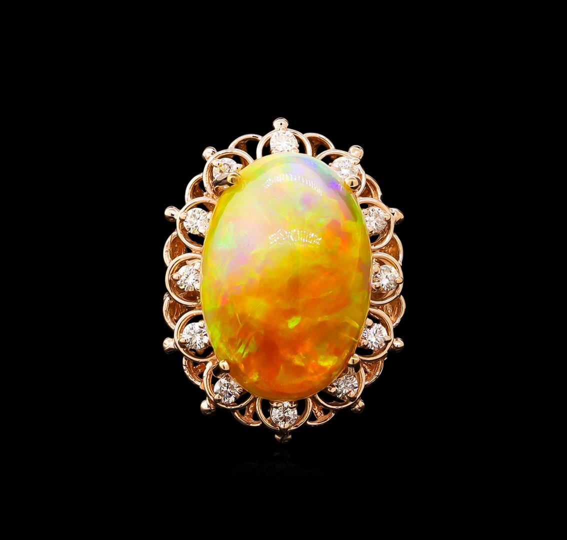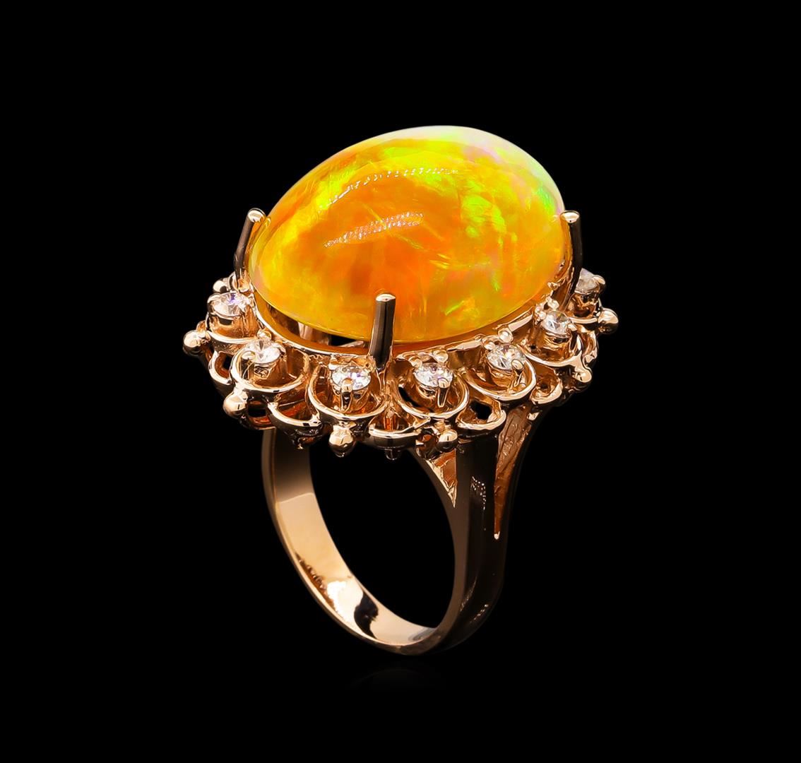 One electronically tested 14KT rose gold lady's cast fashion ring with a basket halo with a bright polish finish. The featured lady's ring has a shank measuring 3.36 millimeters wide. Identified with markings of "K14". Condition is new, good workmanship. Containing: One fire opal that is cut in a oval shaped cabochon and is prong set, measuring 22.14 mm long x 15.32 mm wide, and 11.65 mm thick and the approximate weight is 17.32 carats. The opal has a bright, green-orange play of color (fire) in a rolling flashfire pattern; a high dome; a good cut; no inclusions; distracting variation in base in its brightness and pattern; and is not directional. Graded in the setting. Twelve prong set round brilliant cut diamonds, measuring 2.40 - 2.30 x 1.46mm (depth est.) approximate total weight of 12 Stones = 0.60ct. Graded in the setting. Clarity: SI-1 to SI-2. Color: H - I. Cut Good. Total Weight of Diamonds 0.60ct. Total Weight of Opals 17.32ct. Total Weight of Ring 14.80gm. GAS Appraised at $8,770.00.