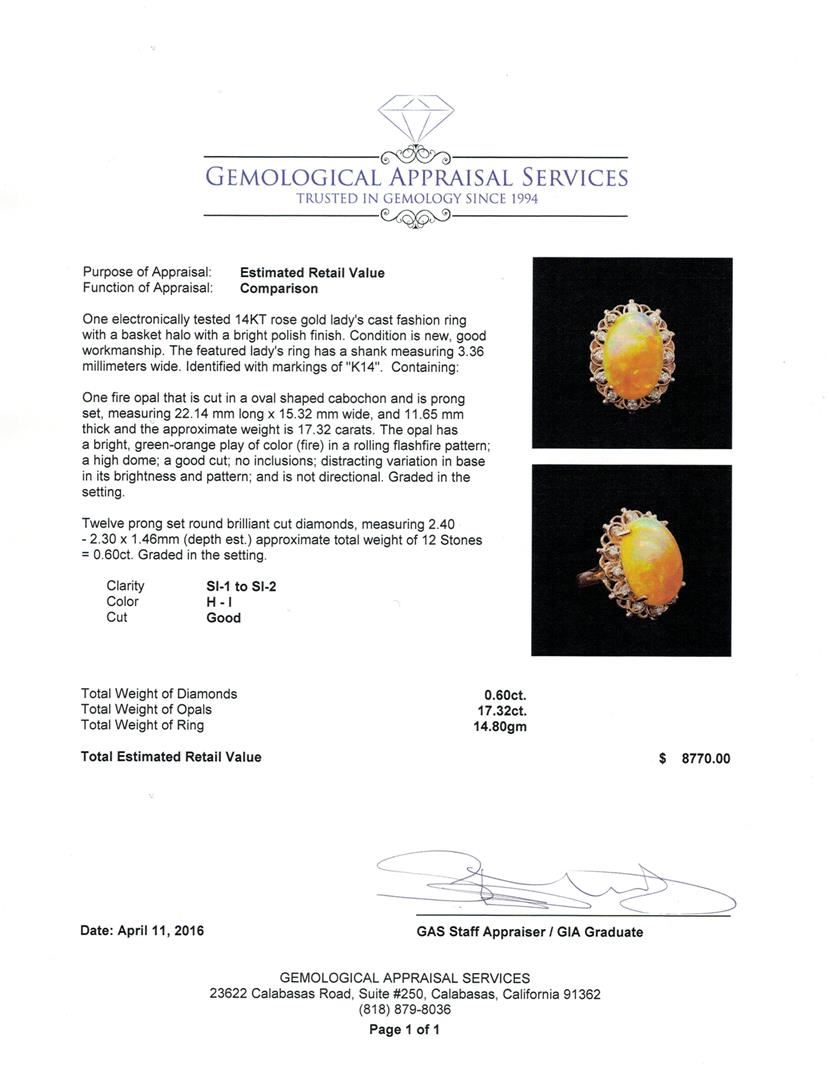 One electronically tested 14KT rose gold lady's cast fashion ring with a basket halo with a bright polish finish. The featured lady's ring has a shank measuring 3.36 millimeters wide. Identified with markings of "K14". Condition is new, good workmanship. Containing: One fire opal that is cut in a oval shaped cabochon and is prong set, measuring 22.14 mm long x 15.32 mm wide, and 11.65 mm thick and the approximate weight is 17.32 carats. The opal has a bright, green-orange play of color (fire) in a rolling flashfire pattern; a high dome; a good cut; no inclusions; distracting variation in base in its brightness and pattern; and is not directional. Graded in the setting. Twelve prong set round brilliant cut diamonds, measuring 2.40 - 2.30 x 1.46mm (depth est.) approximate total weight of 12 Stones = 0.60ct. Graded in the setting. Clarity: SI-1 to SI-2. Color: H - I. Cut Good. Total Weight of Diamonds 0.60ct. Total Weight of Opals 17.32ct. Total Weight of Ring 14.80gm. GAS Appraised at $8,770.00.