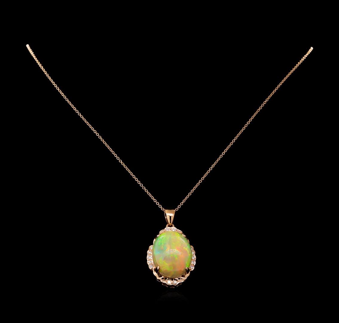 One electronically tested 14KT rose gold lady's combination cast & assembled fashion pendant & chain 18.0" long, 1.2mm round cable link with a lobster claw clasp with a bright polish finish. Identified with markings of "14K". Condition is new, good workmanship. Containing: One crystal opal that is cut in a oval shaped cabochon and is prong set, measuring 21.07 mm long x 17.20 mm wide, and 10.48 mm thick and the approximate weight is 17.32 carats. The opal has a very bright, blue-green play of color (fire) in a rolling flashfire pattern; a high dome; a good cut; no inclusions; consistent in its brightness and pattern; and is not directional. Graded in the setting. Fourteen prong set round brilliant cut diamonds, measuring 1.60 - 1.50 x 0.96mm (depth est.) approximate total weight of 14 Stones = 0.20ct. Graded in the setting. Clarity: VS-2 to SI-1. Color: H - I. Cut Very Good. Total Weight of Diamonds 0.20ct. Total Weight of Opals 17.32ct. Total Weight of Pendant & Chain 11.40gm. GAS Appraised at $9,495.00.