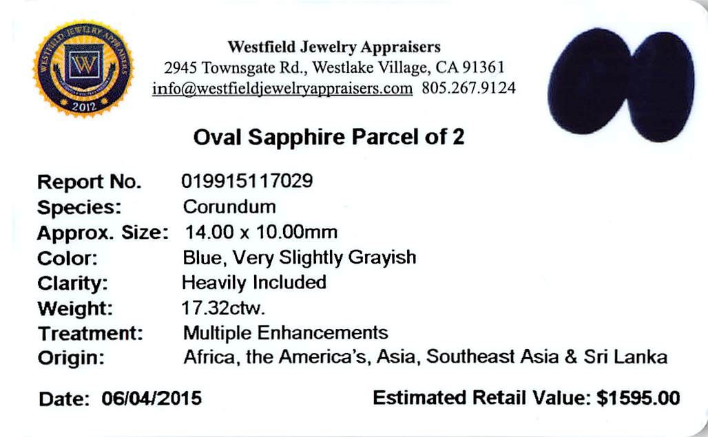 Two oval mixed cut natural blue sapphires, measuring 14.00 x 10.00 x 6.50mm, exact total weight 17.32ct., clarity is heavily included, type II, very dark, very slightly grayish, blue color, (GIA B 8/3), cut is good. Measurements are an average for the group. Transmitting light very diffusely, opaque, Naturally occurring internal & external characteristics are present, Indications of multiple laboratory enhancements, including high temperature heat treatment. Westfield Appraised at $1,595.00.
