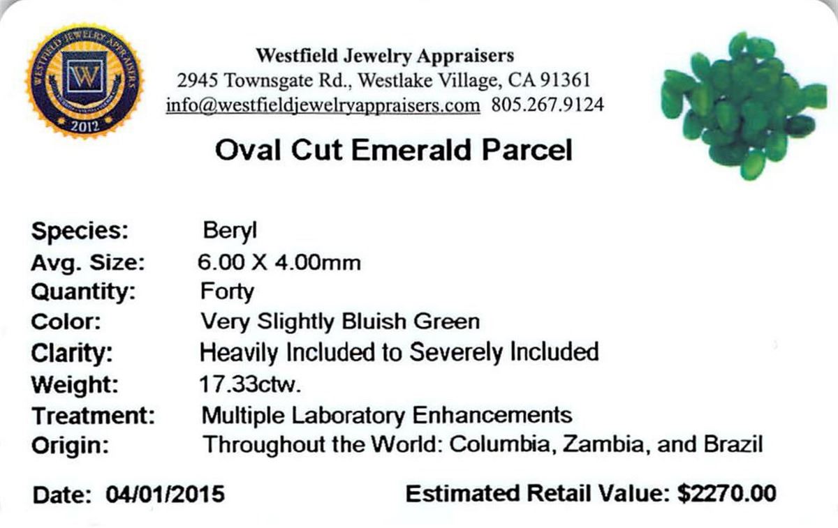 Forty oval mixed cut natural emeralds exact total weight 17.33ct., clarity is heavily included, type III, medium dark, very slightly grayish, very slightly bluish green color, (GIA vslbG 6/3), cut is good. Westfield Appraised at $2,270.00.