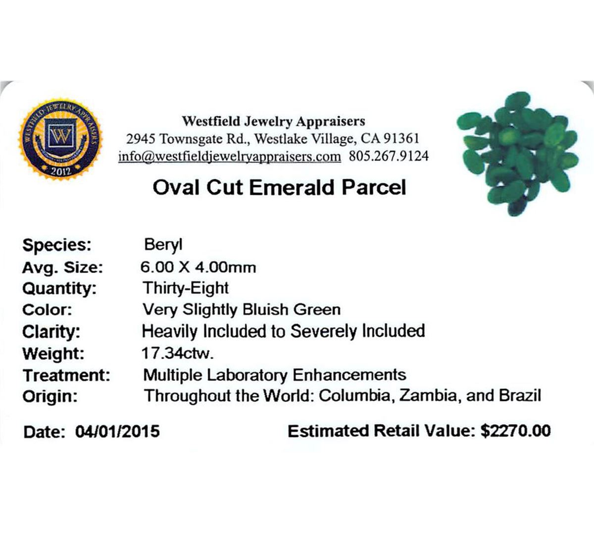Thirty-eight oval mixed cut natural emeralds exact total weight 17.34ct., clarity is heavily included, medium dark, very slightly grayish, very slightly greenish blue color, (GIA vslgB 6/3), cut is good. Westfield Appraised at $2,270.00.