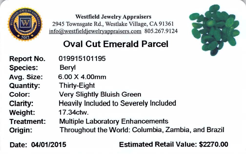 Thirty-eight oval mixed cut natural emeralds exact total weight 17.34ct., clarity is heavily included, medium dark, very slightly grayish, very slightly greenish blue color, (GIA vslgB 6/3), cut is good. Westfield Appraised at $2,270.00.