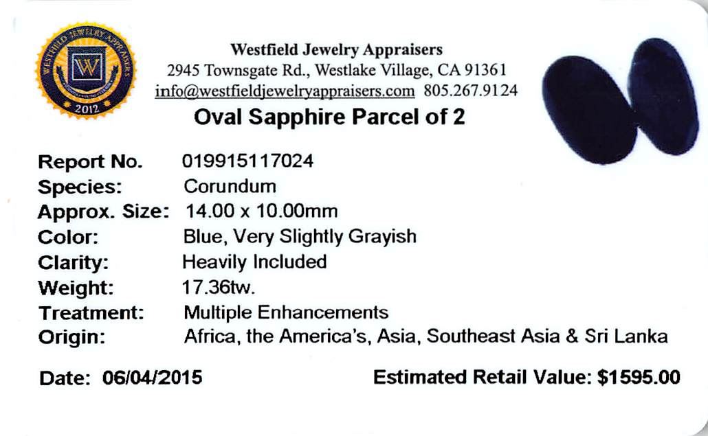 Two oval mixed cut natural blue sapphires, measuring 14.00 x 10.00 x 6.50mm, exact total weight 17.36ct., clarity is heavily included, type II, very dark, very slightly grayish, blue color, (GIA B 8/3), cut is good. Measurements are an average for the group. Transmitting light very diffusely, opaque, Naturally occurring internal & external characteristics are present, Indications of multiple laboratory enhancements, including high temperature heat treatment. Westfield Appraised at $1,595.00.