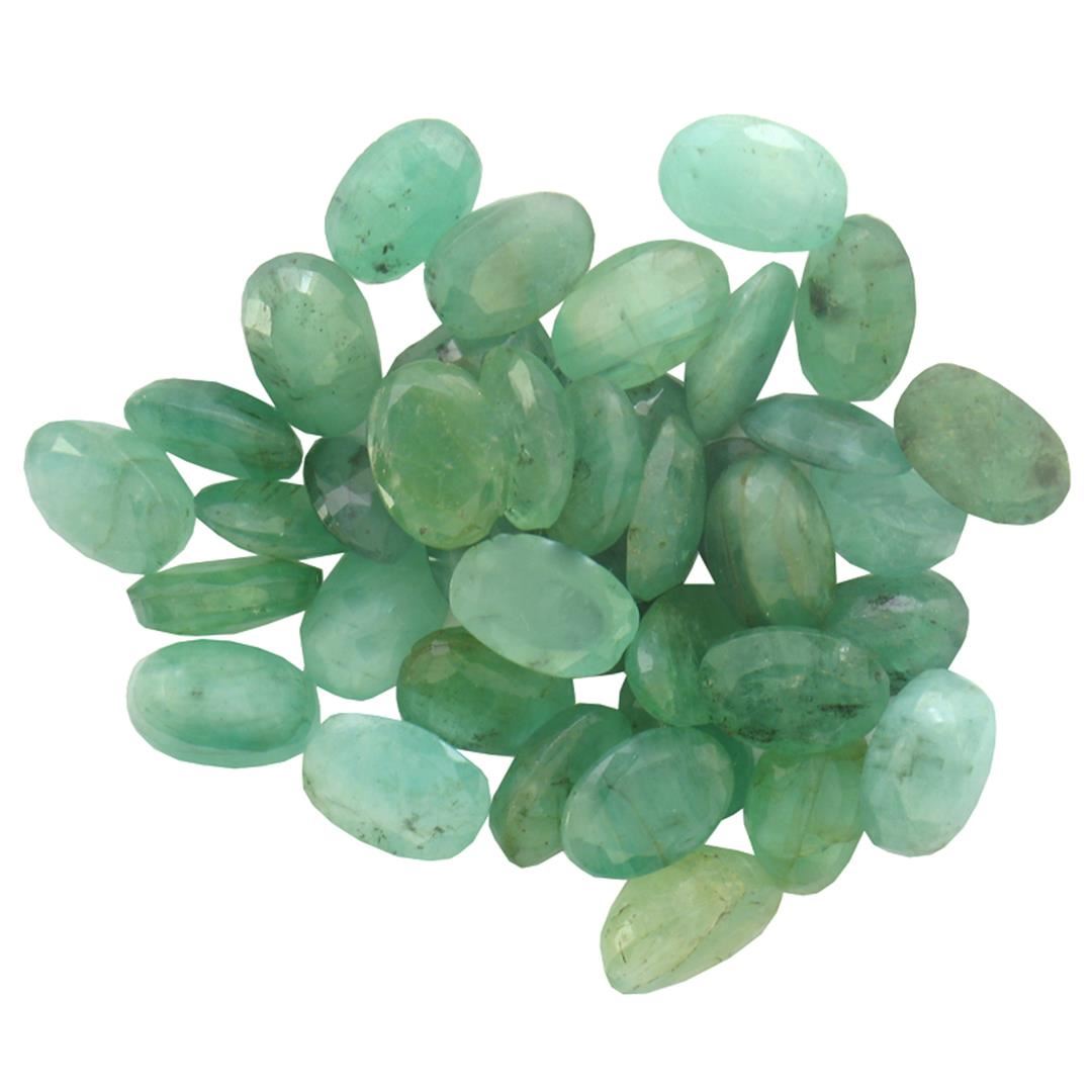 Thirty-nine oval mixed cut natural emeralds exact total weight 17.39ct., clarity is heavily included, type III, medium dark, very slightly grayish, very slightly bluish green color, (GIA vslbG 6/3), cut is good. Westfield Appraised at $2,275.00.
