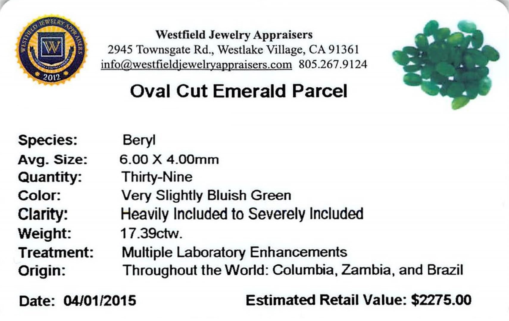 Thirty-nine oval mixed cut natural emeralds exact total weight 17.39ct., clarity is heavily included, type III, medium dark, very slightly grayish, very slightly bluish green color, (GIA vslbG 6/3), cut is good. Westfield Appraised at $2,275.00.