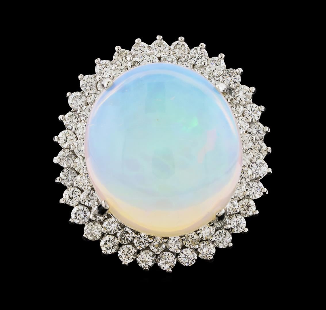 One electronically tested 14KT white gold lady's cast fashion ring with a double basket halo with a bright polish finish. The featured lady's ring has a shank measuring 2.66 millimeters wide. Identified with markings of 'K14'. Condition is new, good workmanship. Containing: Thirty-Two prong set round brilliant cut diamonds, measuring 2.40 - 2.35 x 1.43mm (depth est.) approximate total weight of 32 Stones = 1.58ct. Graded in the setting. Clarity SI-1 to I-1. Color: G - H Cut Good Thirty-Two prong set round brilliant cut diamonds, measuring 2.10 - 2.00 x 1.27mm (depth est.) approximate total weight of 32 Stones = 1.06ct. Graded in the setting. Clarity SI-1 to SI-2. Color: G - H Cut Good One crystal opal that is cut in a oval shaped cabochon and is prong set, measuring 21.69 mm long x 19.60 mm wide, and 10.61 mm thick and the approximate weight is 17.42 carats. The opal has a somewhat bright, multicolor play of color (fire) in a rolling flashfire pattern; a medium dome; a good cut; no inclusions; slight variation in base in its brightness and pattern; and is slightly directional. Graded in the setting.. Total Weight of Diamonds 2.64ct.. Total Weight of Opals 17.42ct.. Total Weight of Ring 13.70gm. GAS Appraised at $11,135.00.