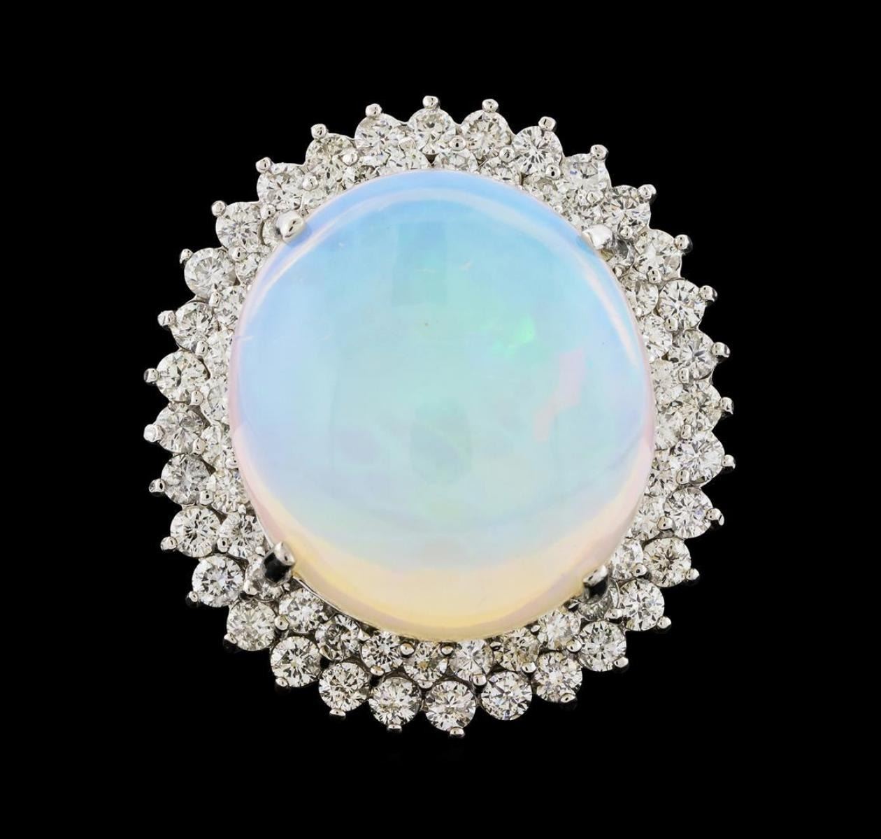 One electronically tested 14KT white gold lady's cast fashion ring with a double basket halo with a bright polish finish. The featured lady's ring has a shank measuring 2.66 millimeters wide. Identified with markings of 'K14'. Condition is new, good workmanship. Containing: Thirty-Two prong set round brilliant cut diamonds, measuring 2.40 - 2.35 x 1.43mm (depth est.) approximate total weight of 32 Stones = 1.58ct. Graded in the setting. Clarity SI-1 to I-1. Color: G - H Cut Good Thirty-Two prong set round brilliant cut diamonds, measuring 2.10 - 2.00 x 1.27mm (depth est.) approximate total weight of 32 Stones = 1.06ct. Graded in the setting. Clarity SI-1 to SI-2. Color: G - H Cut Good One crystal opal that is cut in a oval shaped cabochon and is prong set, measuring 21.69 mm long x 19.60 mm wide, and 10.61 mm thick and the approximate weight is 17.42 carats. The opal has a somewhat bright, multicolor play of color (fire) in a rolling flashfire pattern; a medium dome; a good cut; no inclusions; slight variation in base in its brightness and pattern; and is slightly directional. Graded in the setting.. Total Weight of Diamonds 2.64ct.. Total Weight of Opals 17.42ct.. Total Weight of Ring 13.70gm. GAS Appraised.