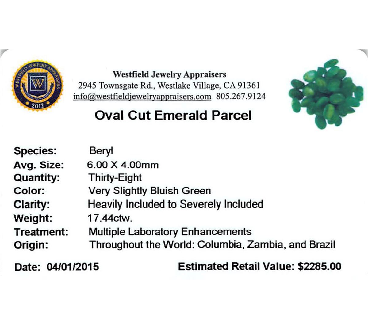 Thirty-nine oval mixed cut natural emeralds exact total weight 17.44ct., clarity is heavily included, type III, medium dark, very slightly grayish, very slightly bluish green color, (GIA vslbG 6/3), cut is good. Westfield Appraised at $2,285.00.