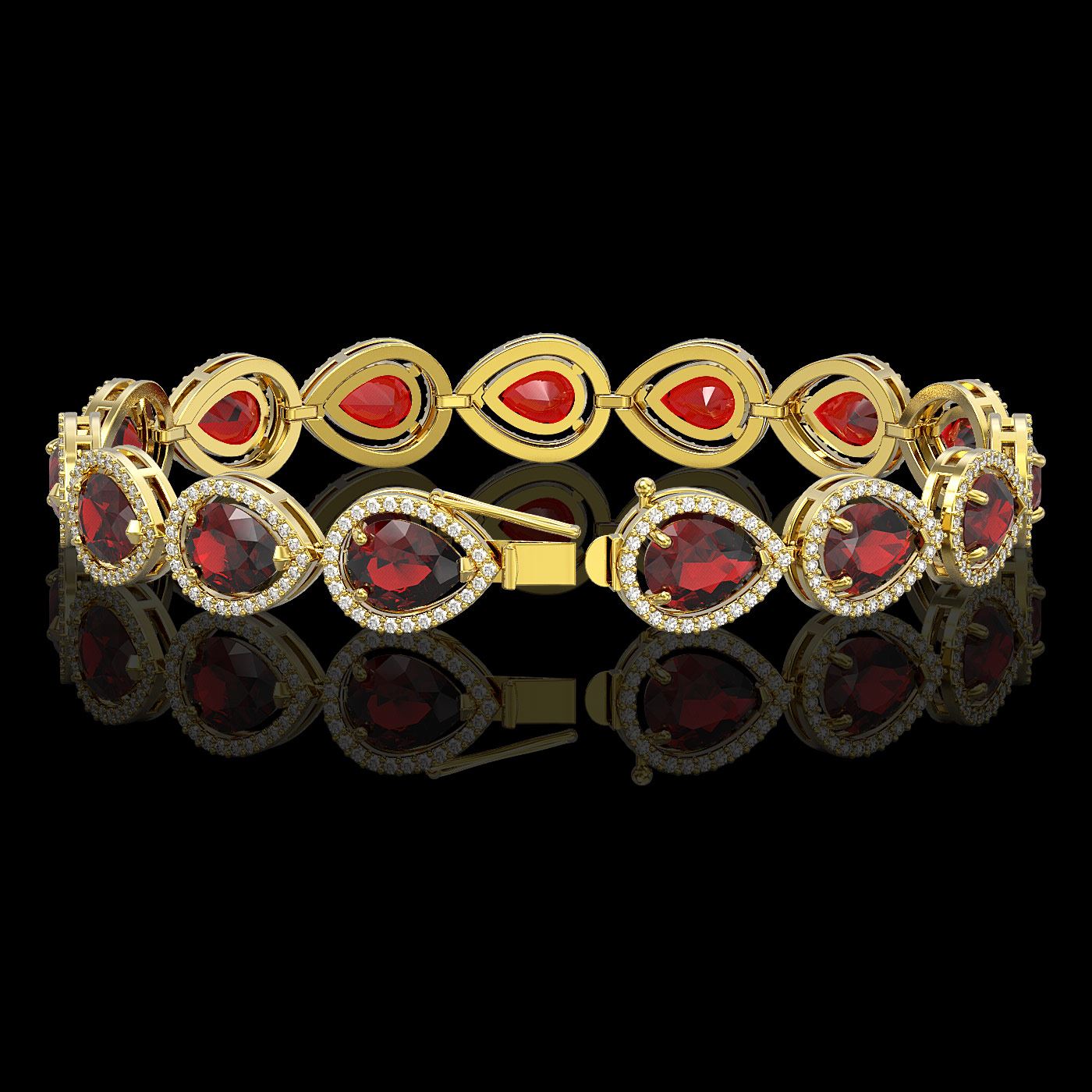 REF-283H5A -41281 ---- 17.45 CTW Garnet & Diamond Halo Bracelet 10K Yellow Gold ---- Luxury Designer Brand Bracelet Appraised at $15,600 Certificate Number US41281 10k Yellow gold, Bracelet Size is 7 Inches, Bracelet measuring approx. 10 mm x 7 Inches, weighing in total approx. 14.5 grams. Made in the USA and is stamped 10k, Main stone 14.4 carat total weight containing 15 pieces of Saturated purplish Red color with AAA quality Pear shape cut Garnet , Stone #2 3.05 carat total weight containing 375 pieces of G-H color with VS/SI quality Round shape cut Diamond