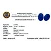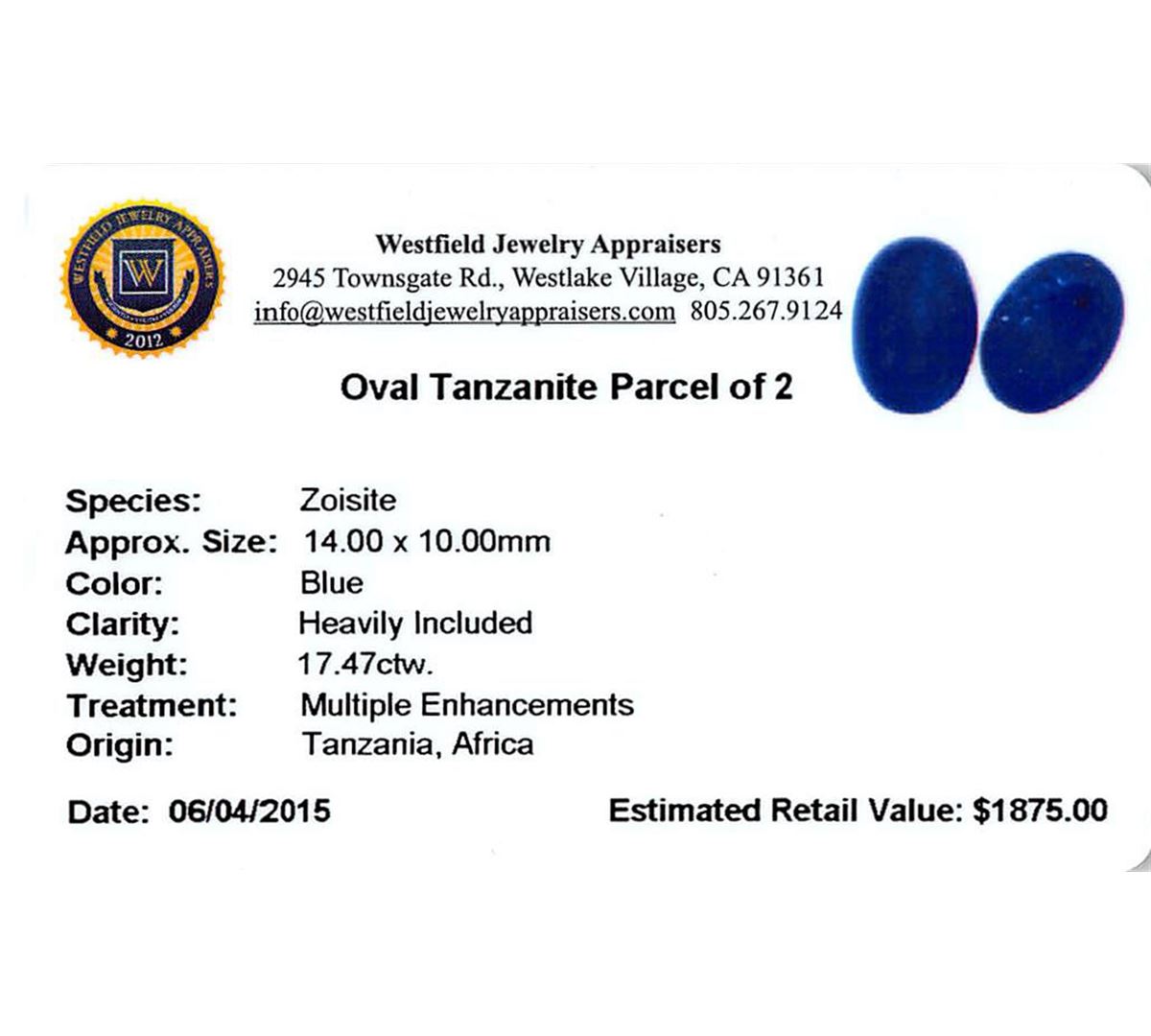 Two oval cabochon cut natural tanzanites, measuring 14.00 x 10.00 x 6.00mm, exact total weight 17.47ct., clarity is heavily included, type I, dark, very slightly grayish, blue color, (GIA B 7/3), cut is good. Measurements are an average for the group. Transmitting light somewhat diffusely, transparent to translucent. Naturally occurring internal & external characteristics are present. Indications of heat treatment. Westfield Appraised at $1,875.00.