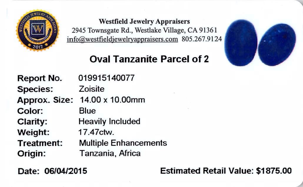 Two oval cabochon cut natural tanzanites, measuring 14.00 x 10.00 x 6.00mm, exact total weight 17.47ct., clarity is heavily included, type I, dark, very slightly grayish, blue color, (GIA B 7/3), cut is good. Measurements are an average for the group. Transmitting light somewhat diffusely, transparent to translucent. Naturally occurring internal & external characteristics are present. Indications of heat treatment. Westfield Appraised at $1,875.00.