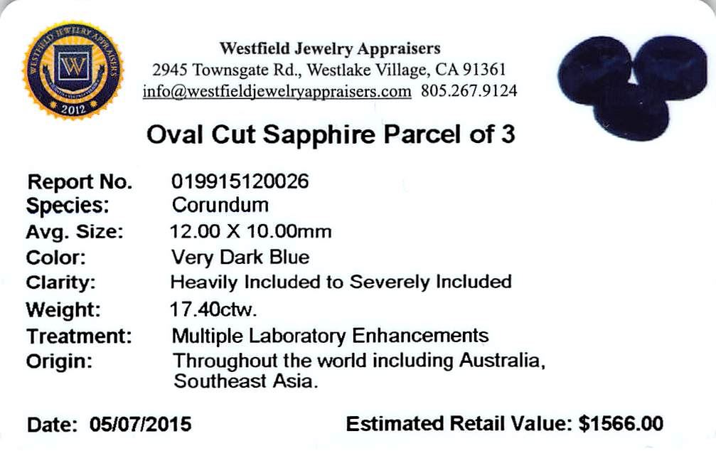 Three oval cut sapphires, measuring 12.00 x 10.00mm, approximate total weight of 17.40ct., clarity is heavily included to severely included, very dark blue color. Indications of multiple laboratory enhancements. Westfield Appraised at $1,566.00.