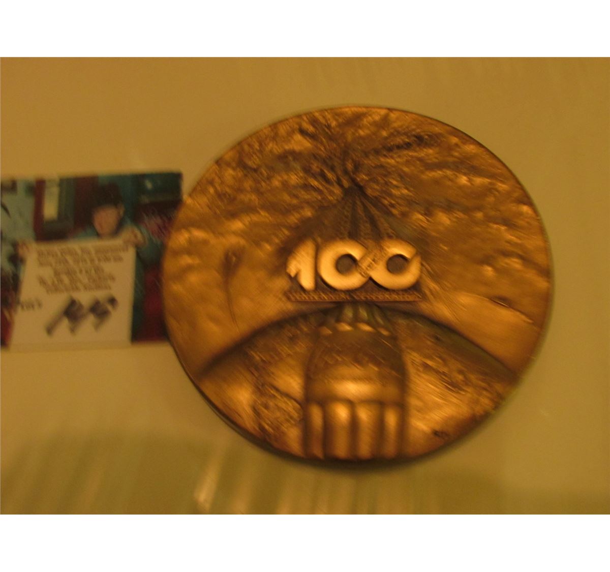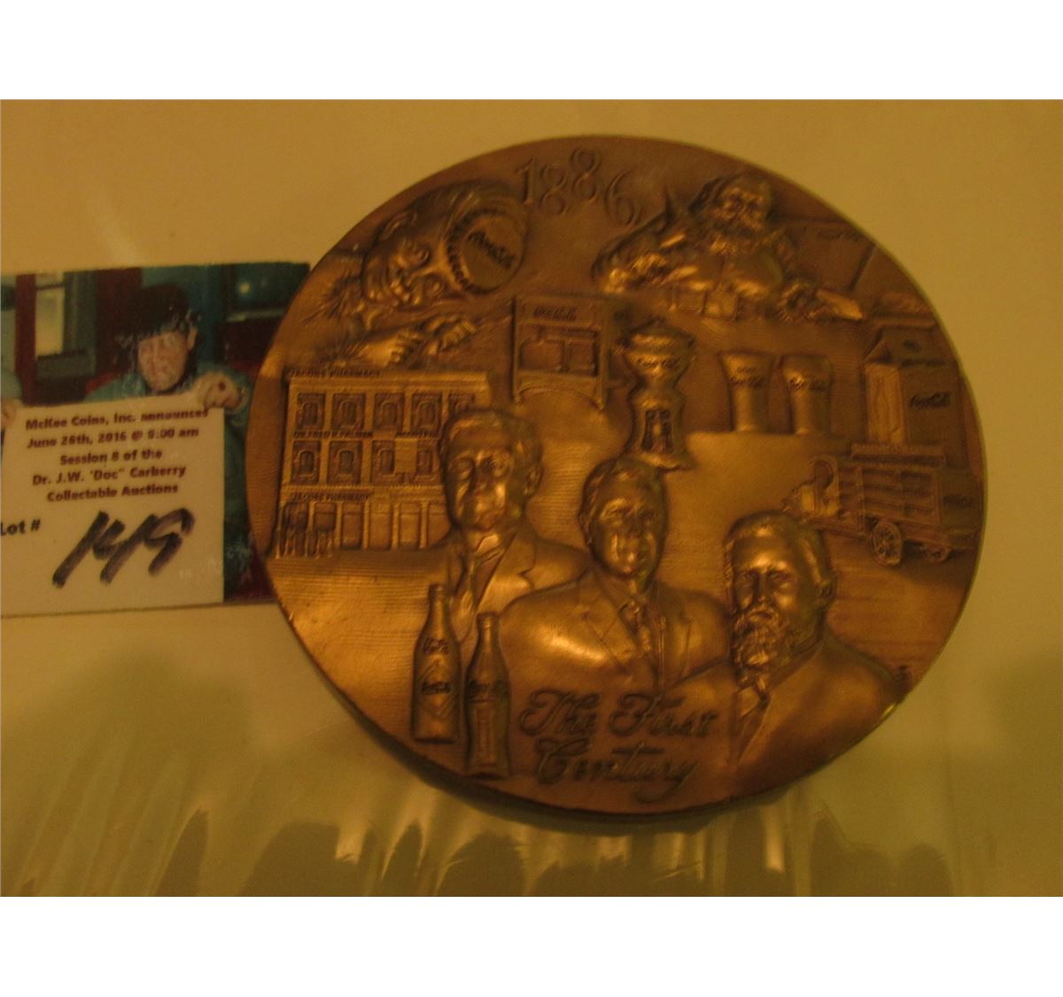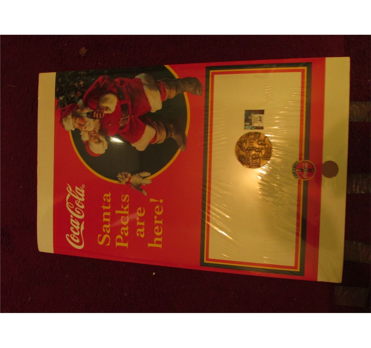 17.5" x 24" "Coca-Cola Santa Packs are Here" Poster & 1886-1986 Coca-Cola Distributor Large Bronze Medal, 3" x 1/4", depicts 100 Centennial Celebration bottle, rocket ship, etc. These were only given out to Distributors.