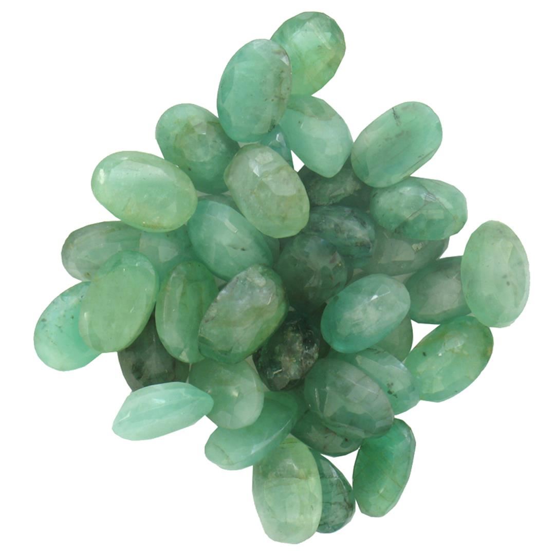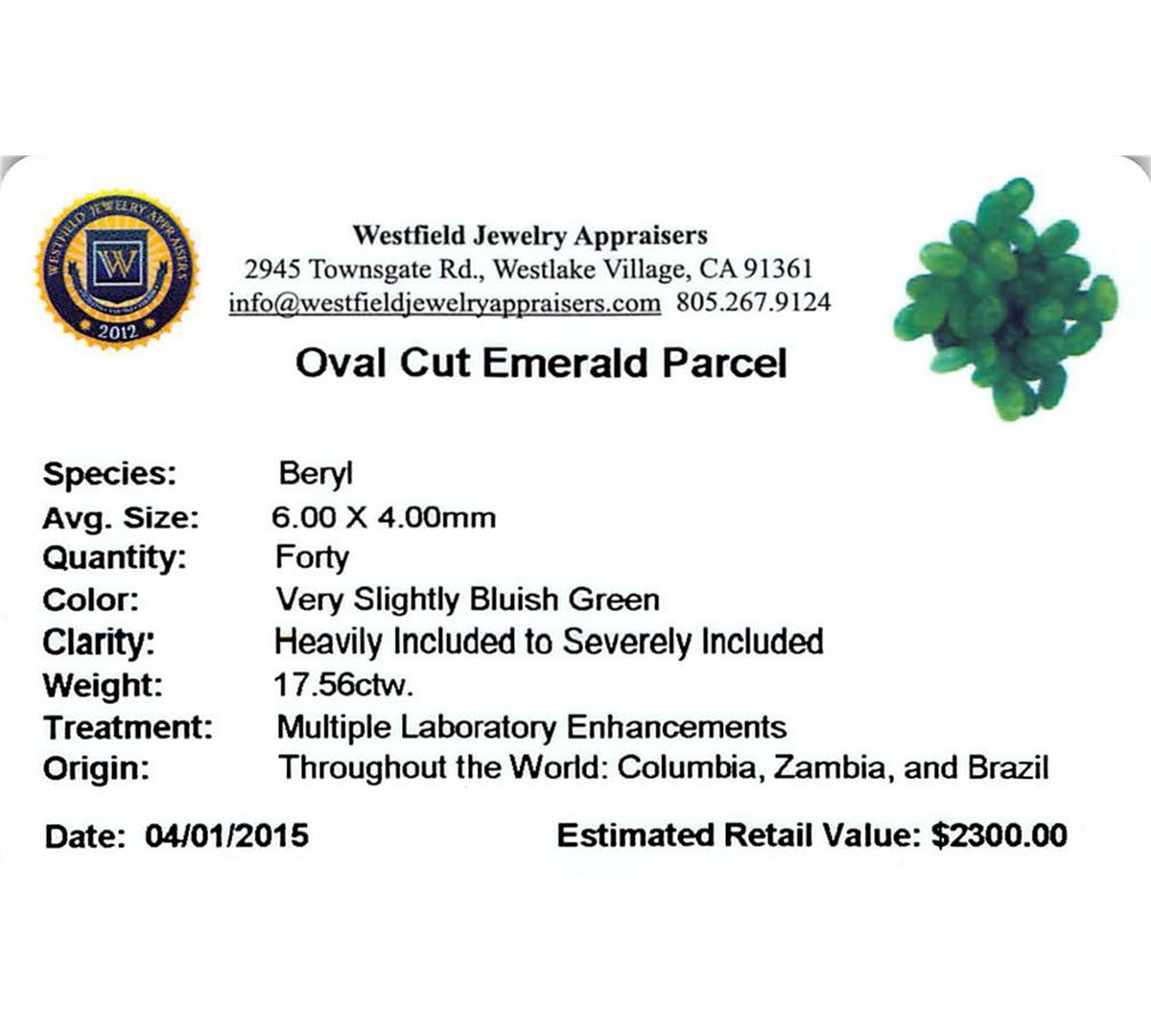 Forty oval mixed cut natural emeralds exact total weight 17.56ct., clarity is heavily included, type III, medium dark, very slightly grayish, very slightly bluish green color, (GIA vslbG 6/3), cut is good. Westfield Appraised at $2,300.00.