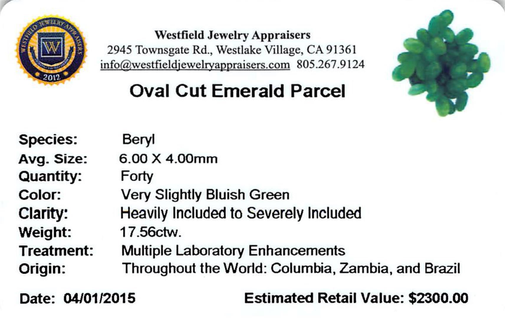 Forty oval mixed cut natural emeralds exact total weight 17.56ct., clarity is heavily included, type III, medium dark, very slightly grayish, very slightly bluish green color, (GIA vslbG 6/3), cut is good. Westfield Appraised at $2,300.00.
