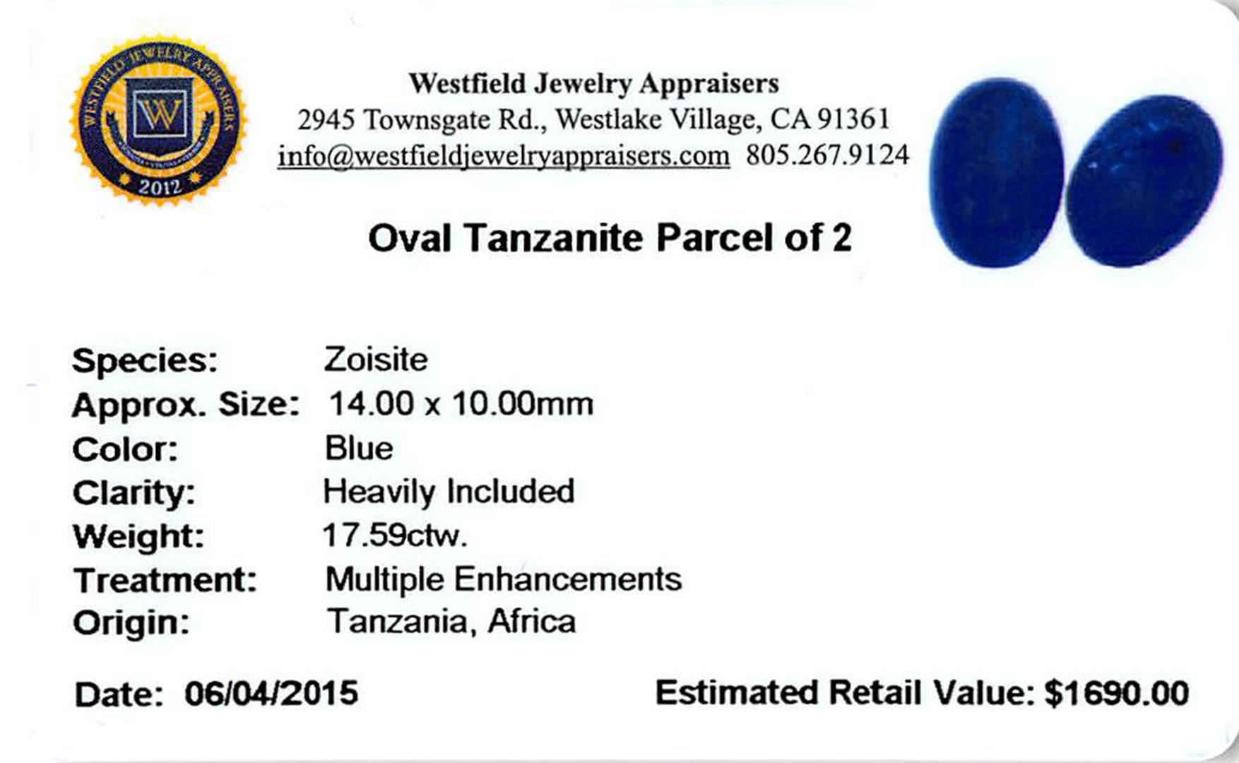 Two oval cabochon cut natural tanzanites, measuring 14.00 x 10.00 x 5.00mm, exact total weight 17.59ct., clarity is heavily included, type I, dark, very slightly grayish, blue color, (GIA B 7/3), cut is good. Measurements are an average for the group. Transmitting light somewhat diffusely, transparent to translucent. Naturally occurring internal & external characteristics are present. Indications of heat treatment. Westfield Appraised at $1,690.00.
