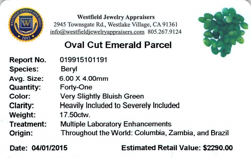 Forty-one oval and pear mixed cut natural emeralds exact total weight 17.50ct., clarity is heavily included, type III, medium dark, very slightly grayish, very slightly bluish green color, (GIA vslbG 6/3), cut is good. Westfield Appraised at $2,290.00.