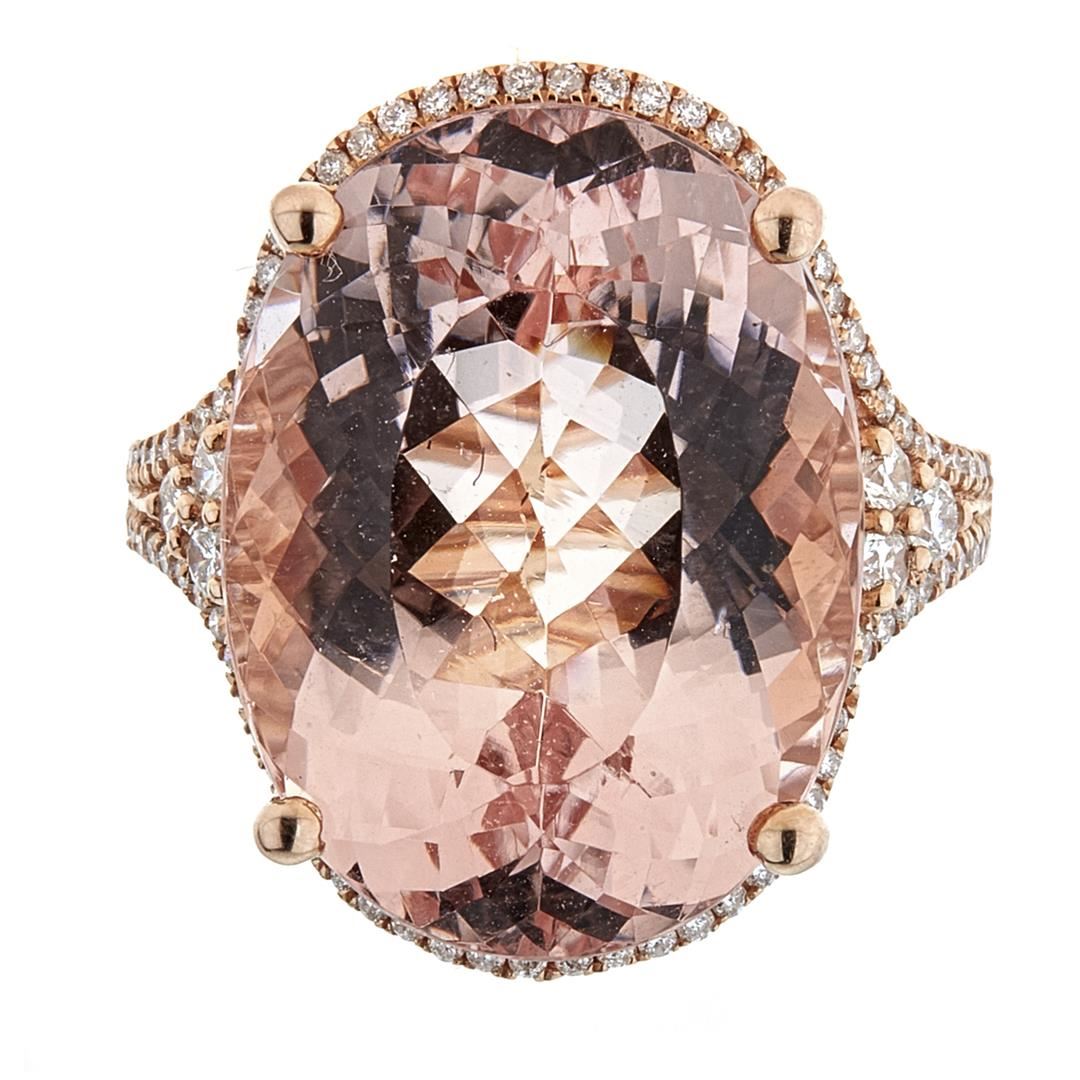 One lady's morganite and diamond ring. Setting: 14KT rose gold mounting. Additional: 90 round diamonds = 0.55cts. TWT (G-H/SI-I1). Center gem stone information; species: natural beryl. Variety: morganite. Shape and cut: oval mixed cut. Measurements: 20.42 x 15.31 x 10.50mm. Weight: 17.63 carats. Transparency: Transparent. Color hue: pink. Saturation: moderate. Total Weight: 5.4 grams.