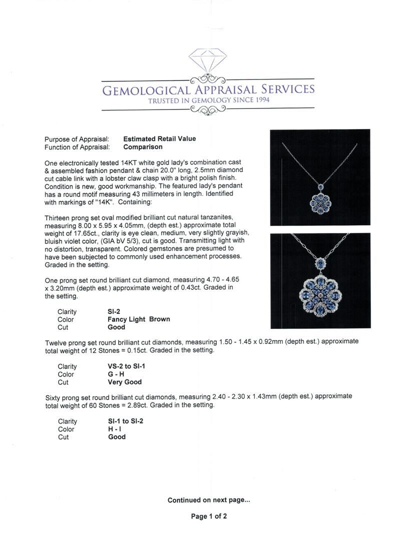 One electronically tested 14KT white gold lady's combination cast & assembled fashion pendant & chain 20.0" long, 2.5mm diamond cut cable link with a lobster claw clasp with a bright polish finish. The featured lady's pendant has a round motif measuring 43 millimeters in length. Identified with markings of "14K". Condition is new, good workmanship. Containing: Thirteen prong set oval modified brilliant cut natural tanzanites, measuring 8.00 x 5.95 x 4.05mm, (depth est.) approximate total weight of 17.65ct., clarity is eye clean, medium, very slightly grayish, bluish violet color, (GIA bV 5/3), cut is good. Transmitting light with no distortion, transparent. Colored gemstones are presumed to have been subjected to commonly used enhancement processes. Graded in the setting. One prong set round brilliant cut diamond, measuring 4.70 - 4.65 x 3.20mm (depth est.) approximate weight of 0.43ct. Graded in the setting. Clarity: SI-2 Cut Good Twelve prong set round brilliant cut diamonds, measuring 1.50 - 1.45 x 0.92mm (depth est.) approximate total weight of 12 Stones = 0.15ct. Graded in the setting. Clarity: VS-2 to SI-1. Color: G - Very Good Sixty prong set round brilliant cut diamonds, measuring 2.40 - 2.30 x 1.43mm (depth est.) approximate total weight of 60 Stones = 2.89ct. Graded in the setting. Clarity: SI-1 to SI-2. Color: H - I. Cut Good. Total Weight of Colored Stones 17.65ct. Total Weight of Diamonds 3.47ct. Total Weight of Pendant & Chain 24.80gm GAS Appraised at $22,510.00.