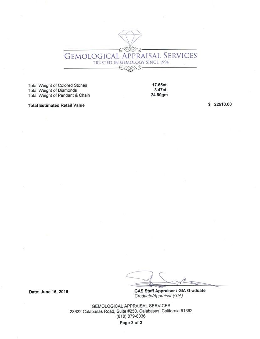 One electronically tested 14KT white gold lady's combination cast & assembled fashion pendant & chain 20.0" long, 2.5mm diamond cut cable link with a lobster claw clasp with a bright polish finish. The featured lady's pendant has a round motif measuring 43 millimeters in length. Identified with markings of "14K". Condition is new, good workmanship. Containing: Thirteen prong set oval modified brilliant cut natural tanzanites, measuring 8.00 x 5.95 x 4.05mm, (depth est.) approximate total weight of 17.65ct., clarity is eye clean, medium, very slightly grayish, bluish violet color, (GIA bV 5/3), cut is good. Transmitting light with no distortion, transparent. Colored gemstones are presumed to have been subjected to commonly used enhancement processes. Graded in the setting. One prong set round brilliant cut diamond, measuring 4.70 - 4.65 x 3.20mm (depth est.) approximate weight of 0.43ct. Graded in the setting. Clarity: SI-2 Cut Good Twelve prong set round brilliant cut diamonds, measuring 1.50 - 1.45 x 0.92mm (depth est.) approximate total weight of 12 Stones = 0.15ct. Graded in the setting. Clarity: VS-2 to SI-1. Color: G - Very Good Sixty prong set round brilliant cut diamonds, measuring 2.40 - 2.30 x 1.43mm (depth est.) approximate total weight of 60 Stones = 2.89ct. Graded in the setting. Clarity: SI-1 to SI-2. Color: H - I. Cut Good. Total Weight of Colored Stones 17.65ct. Total Weight of Diamonds 3.47ct. Total Weight of Pendant & Chain 24.80gm GAS Appraised at $22,510.00.