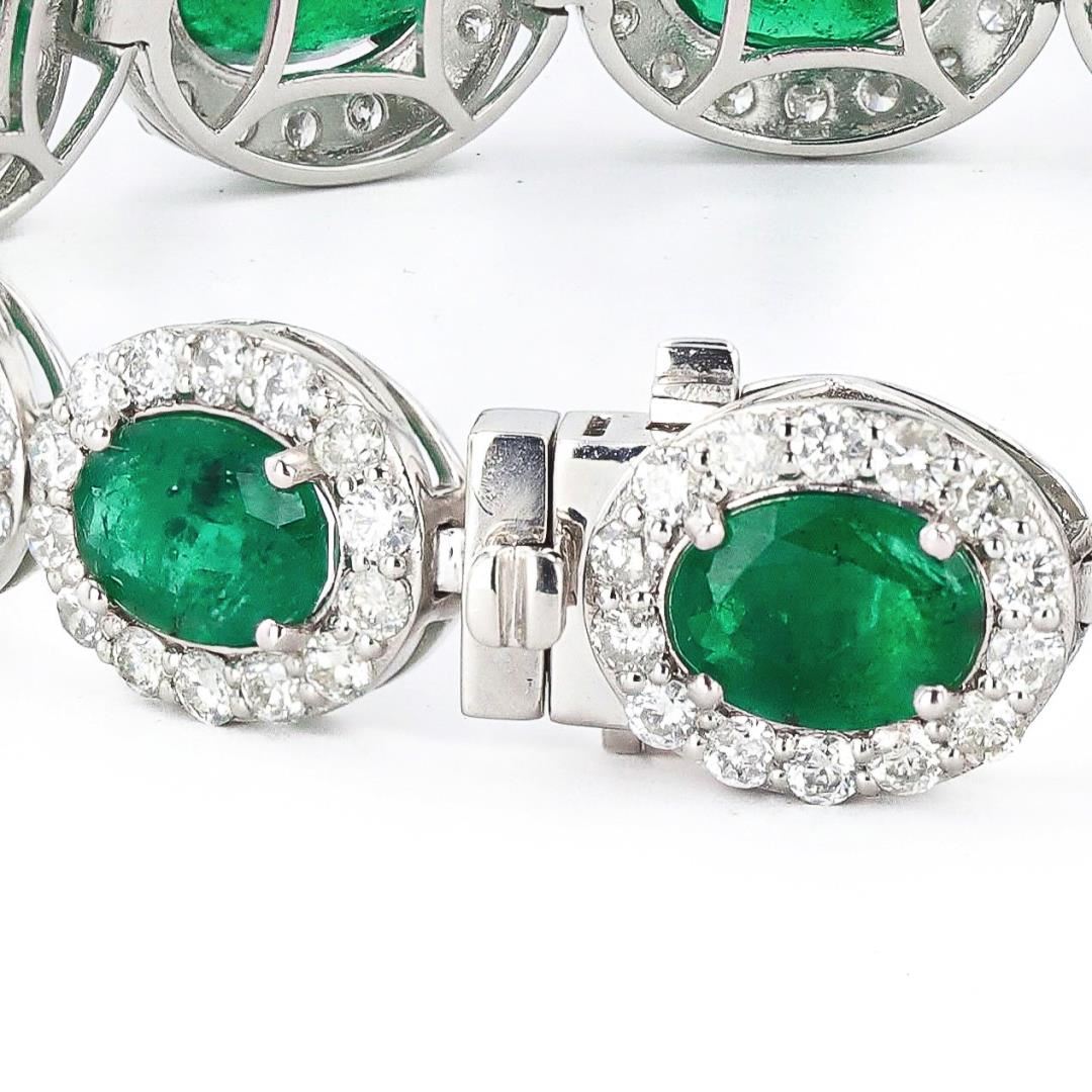 One polished. stamped. and tested platinum bracelet marked Oscar Friedman. The bracelet is mounted with: 14 genuine oval shaped emeralds weighing approximately 17.67 carats, and 208 genuine round diamonds weighing approximately 6.09 carats. The bracelet measures 7.25 inches in length and is finished with a tension lock clasp and a folding safety clasp. This item weighs 29.2 grams, condition is new, excellent workmanship. #MAIN GEMSTONES# Species: Natural Beryl; Variety: Emerald; Shape: Oval; Cutting Style: Brilliant Cut Crown, Step Cut Pavilion; Quantity: 14 Emeralds; Measurements: 8 x 6 - 9 x 7mm; Total Weight: 17.67 carats; Color: Green; Cut Grade: Very Good; Refractive Index: 1.564 - 1.595 DR; Birefringence: 0.005 to 0.009; Hardness: 7.5 - 8 #ADJACENT GEMSTONES ON BRACELET# Identity: Natural Diamond; Shape: Round; Cutting Style: Brilliant Cut; Quantity: 208 Diamonds; Measurements: 1.8 - 2.0mm; Total Weight: 6.09 carats; Clarity Grade: SI1-I2; Color Grade: G-H; Refractive Index: 2.417; Hardness: 10; TOTAL EMERALD WEIGHT: 17.67 cts; TOTAL DIAMOND WEIGHT: 6.09 cts; WEIGHT OF ITEM: 29.2 grams; METAL: Platinum #Size: 7