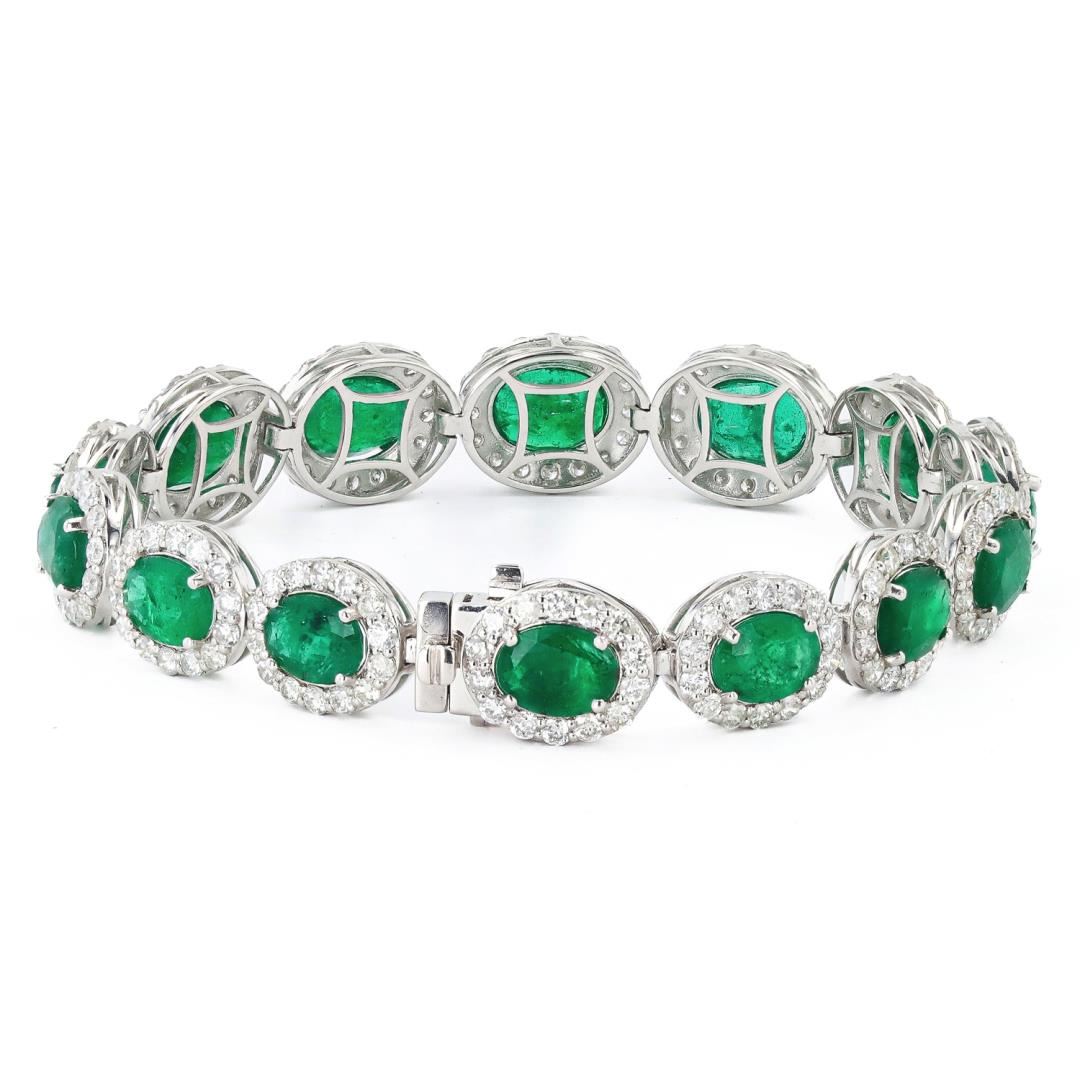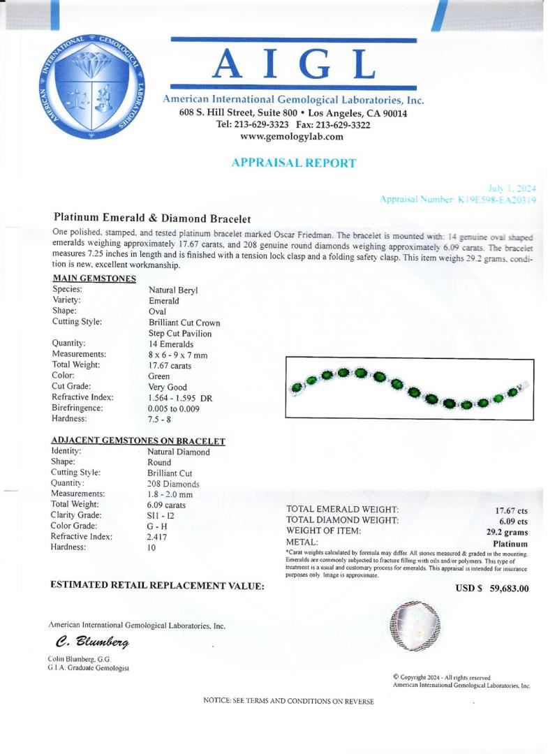 One polished. stamped. and tested platinum bracelet marked Oscar Friedman. The bracelet is mounted with: 14 genuine oval shaped emeralds weighing approximately 17.67 carats, and 208 genuine round diamonds weighing approximately 6.09 carats. The bracelet measures 7.25 inches in length and is finished with a tension lock clasp and a folding safety clasp. This item weighs 29.2 grams, condition is new, excellent workmanship. #MAIN GEMSTONES# Species: Natural Beryl; Variety: Emerald; Shape: Oval; Cutting Style: Brilliant Cut Crown, Step Cut Pavilion; Quantity: 14 Emeralds; Measurements: 8 x 6 - 9 x 7mm; Total Weight: 17.67 carats; Color: Green; Cut Grade: Very Good; Refractive Index: 1.564 - 1.595 DR; Birefringence: 0.005 to 0.009; Hardness: 7.5 - 8 #ADJACENT GEMSTONES ON BRACELET# Identity: Natural Diamond; Shape: Round; Cutting Style: Brilliant Cut; Quantity: 208 Diamonds; Measurements: 1.8 - 2.0mm; Total Weight: 6.09 carats; Clarity Grade: SI1-I2; Color Grade: G-H; Refractive Index: 2.417; Hardness: 10; TOTAL EMERALD WEIGHT: 17.67 cts; TOTAL DIAMOND WEIGHT: 6.09 cts; WEIGHT OF ITEM: 29.2 grams; METAL: Platinum #Size: 7
