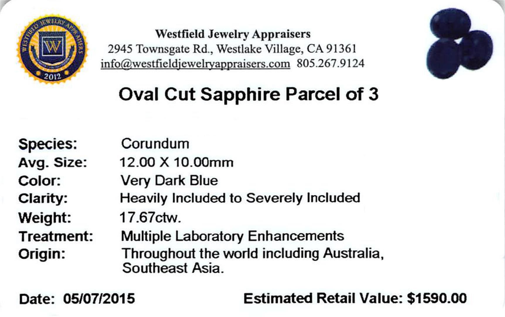 Three oval cut sapphires, measuring 12.00 x 10.00mm, approximate total weight of 17.67ct., clarity is heavily included to severely included, very dark blue color. Indications of multiple laboratory enhancements. Westfield Appraised at $1,590.00.