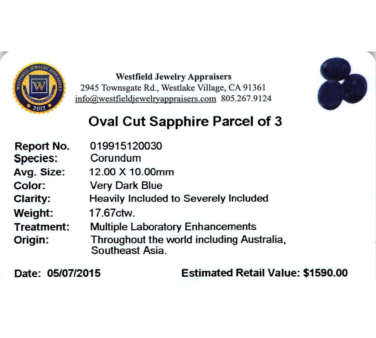 Three oval cut sapphires, measuring 12.00 x 10.00mm, approximate total weight of 17.67ct., clarity is heavily included to severely included, very dark blue color. Indications of multiple laboratory enhancements. Westfield Appraised at $1,590.00.
