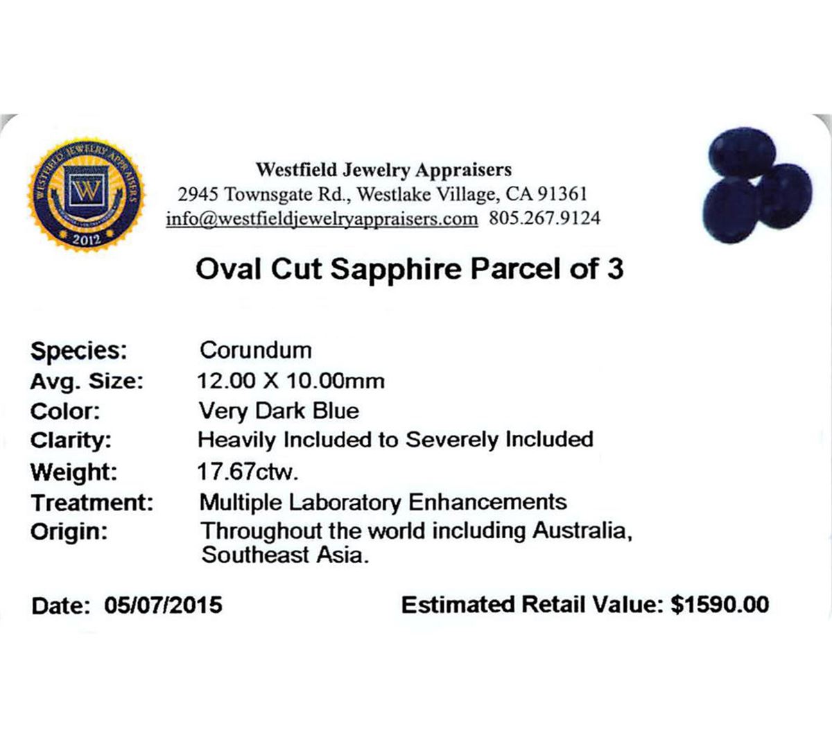 Three oval cut sapphires, measuring 12.00 x 10.00mm, approximate total weight of 17.67ct., clarity is heavily included to severely included, very dark blue color. Indications of multiple laboratory enhancements. Westfield Appraised at $1,590.00.