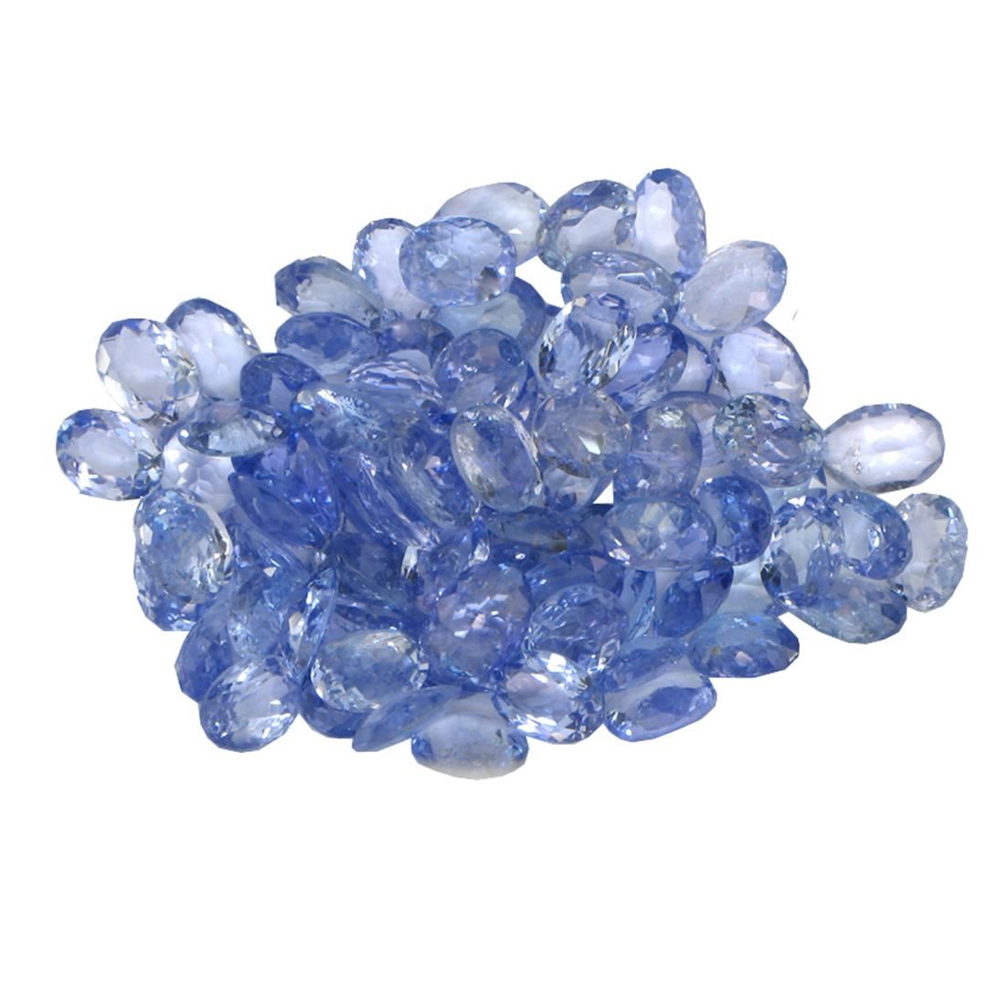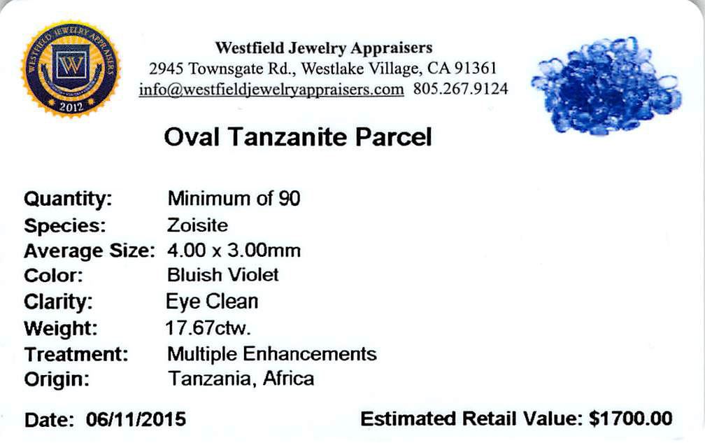 Ninety oval mixed cut natural tanzanites, measuring 4.00 x 3.00 x 1.95mm, exact total weight 17.67ct., clarity is eye clean, type I, medium dark, very slightly grayish, bluish violet color, (GIA bV 6/3), cut is good. Transmitting light with no distortion, transparent. Color grade is an average for the group. Graded in the setting. Tanzanite is a very rare gemstone that is only found in the country of Tanzania. Originally discovered in 1967. Tiffany & Company, named the stone Tanzanite. It is found in the Usumburu Mountains that border the Umba Valley of northern Tanzania. Tanzanite occurs in gray, brown, violet, blue, reddish-purple, & green. The gem is interesting because of its exceptional pleochroism. Rotated in different directions a tanzanite will exhibit multiple changes of color. Tanzanite has a low tolerance to ultrasonic cleaning, and should not be cleaned using this method. Westfield Appraised at $1,700.00.