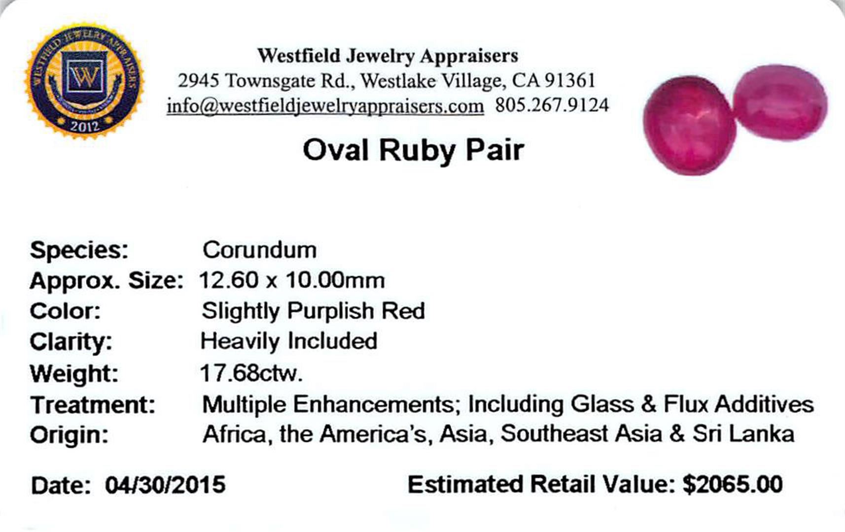Two oval mixed cut natural rubies, measuring 12.60 x 10.00 x 5.80mm, exact total weight 17.68ct., clarity is heavily included, type II, dark, slightly brownish, slightly purplish red color, (GIA slpR 7/2), cut is good. Transmitting light somewhat diffusely, translucent. Naturally occurring internal & external characteristics are present. Indications of laboratory high temperature heat treatment, with glass & flux additives. Ruby has a low tolerance to rhodium plating, repolishing the surface, & ultrasonic cleaning. Westfield Appraised at $2,065.00.