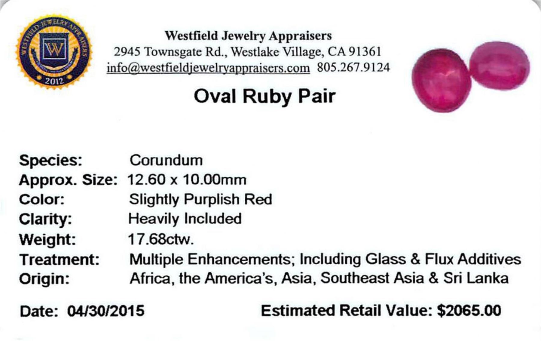 Two oval mixed cut natural rubies, measuring 12.60 x 10.00 x 5.80mm, exact total weight 17.68ct., clarity is heavily included, type II, dark, slightly brownish, slightly purplish red color, (GIA slpR 7/2), cut is good. Transmitting light somewhat diffusely, translucent. Naturally occurring internal & external characteristics are present. Indications of laboratory high temperature heat treatment, with glass & flux additives. Ruby has a low tolerance to rhodium plating, repolishing the surface, & ultrasonic cleaning. Westfield Appraised.